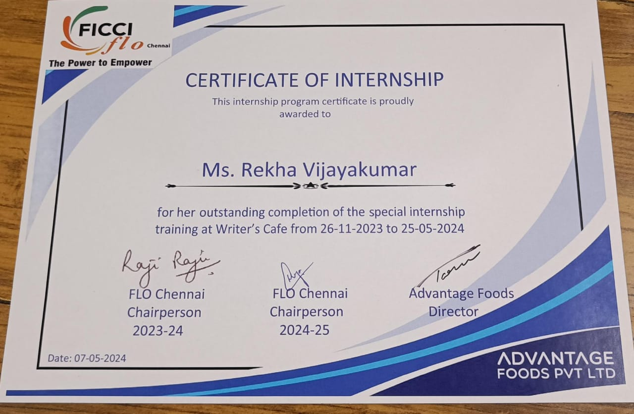 Gratitude to FICCI FLO's initiative to think of V-Excel and choose some students to train them in different skills at Writer's Cafe. Special mention to Ms. Subha Srikant and Ms. Meera to connecting with us constantly, guiding and updating at every step and helping with smooth sails. Grateful to Mr. Tarun Mahadevan, Director, Advantage Food to plan a interesting and extensive training programme for our trainees. Was an enriching experience for all. Ms. Sharada too was very helpful and supported continuously.