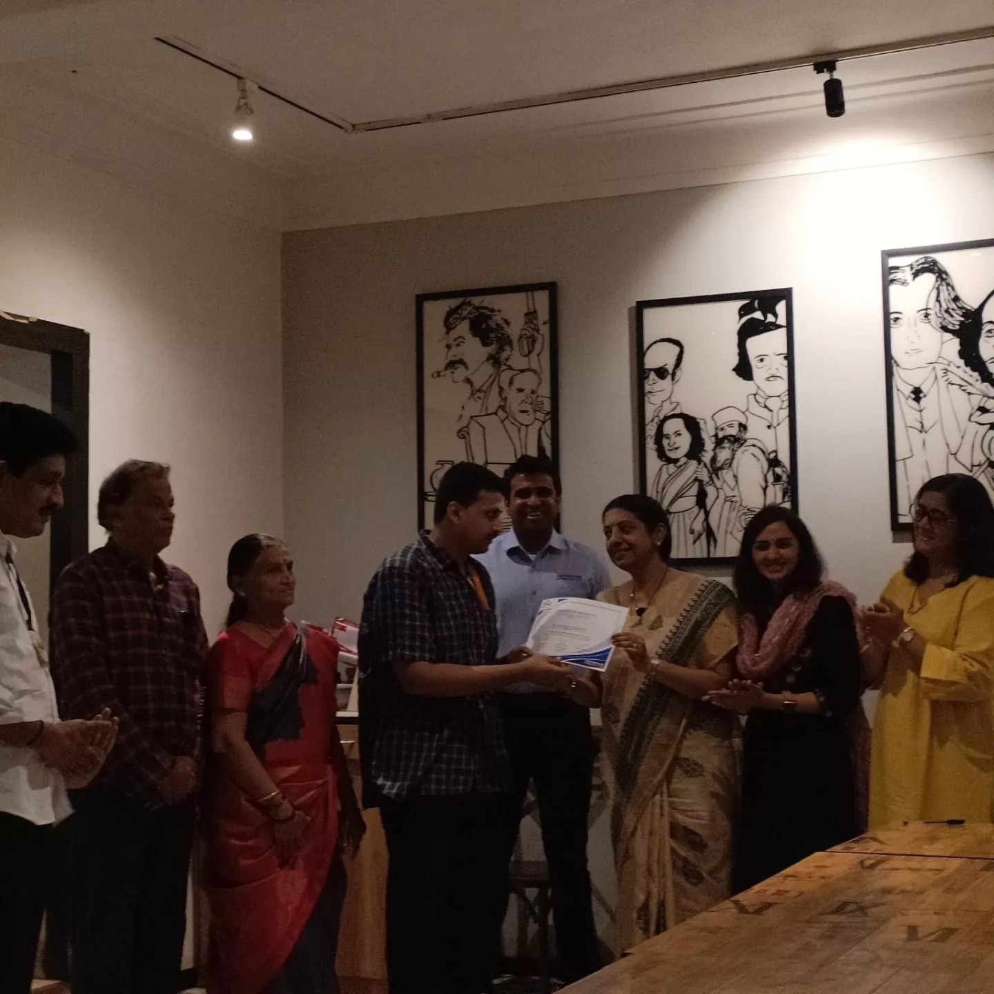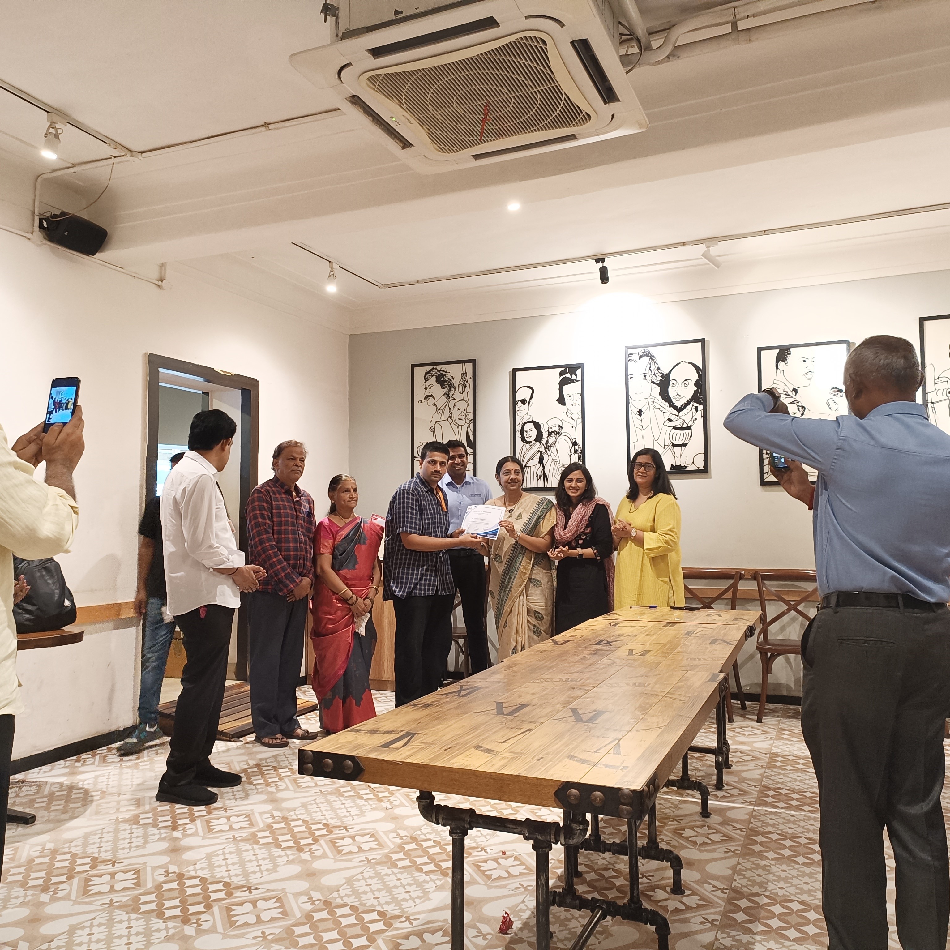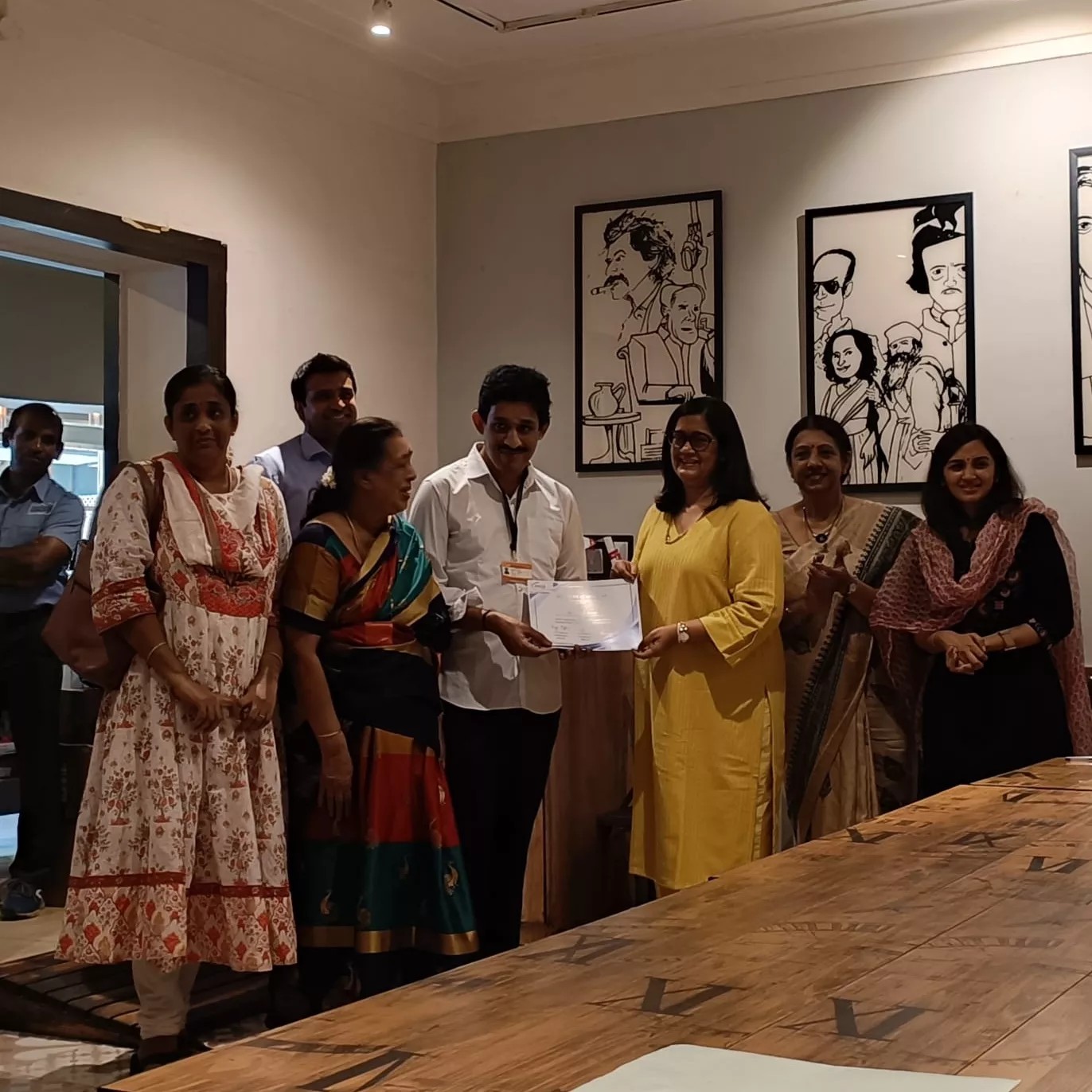 2 trainees from YES, Akshaya and Srinivasan, who were part of the training program at Writer's Cafe along with a couple of other trainees from the other units of V-Excel, completed their training successfully and were awarded with the completion certificate. The felicitation event happened on 07 May 2024, at Peter's Road Writer's Cafe. A team from FICCI FLO, who initiated this project along with the Writer's Cafe team including Mr. Tarun Mahadevan, Director Hot Breads, participated in the event and felicitated the trainees.