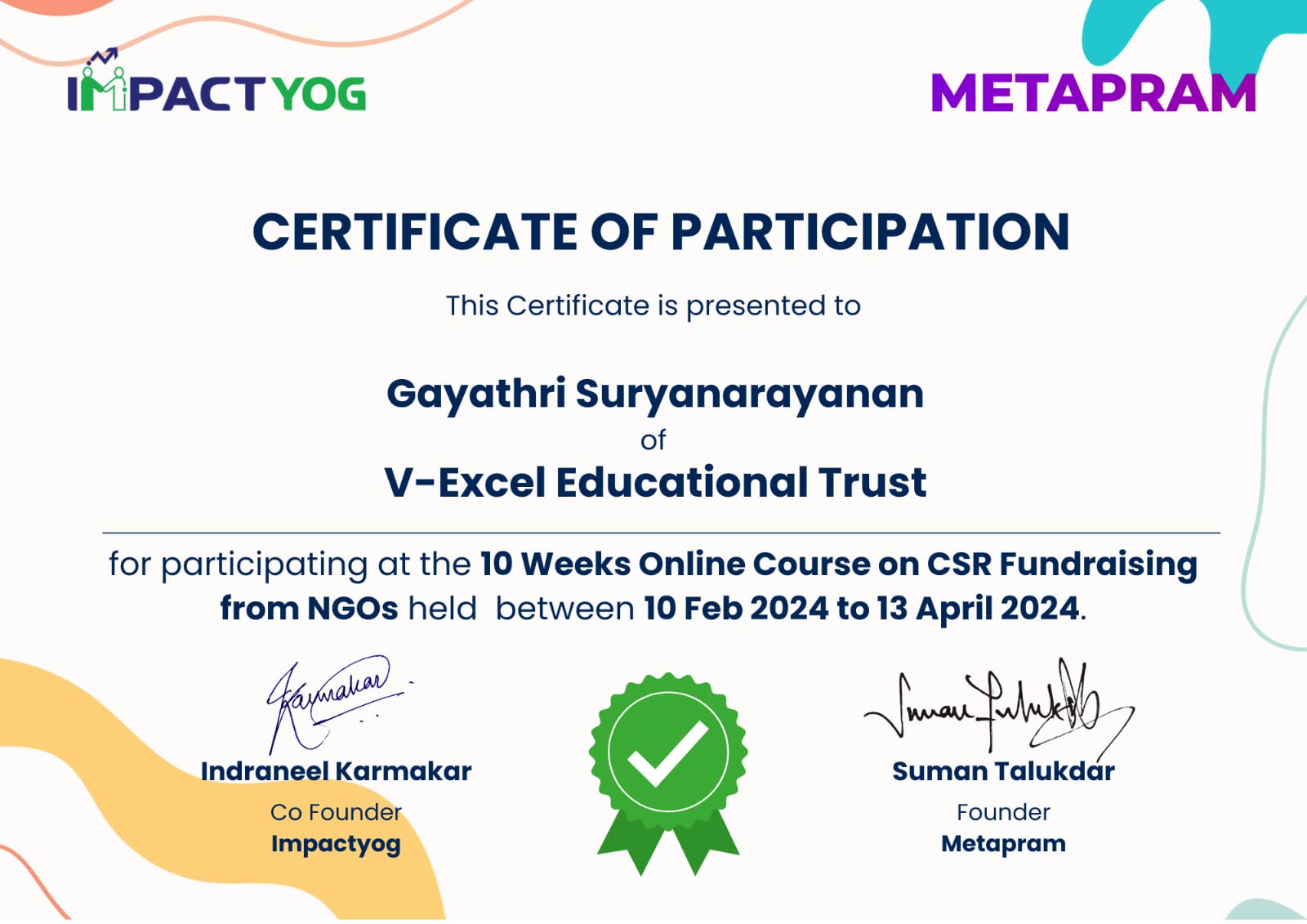 Gayathri Suryanarayanan, the Center Coordinator of YES, successfully completed a 10-week online course on CSR Funding. The course was organized and conducted by ImpactYog and Metapram