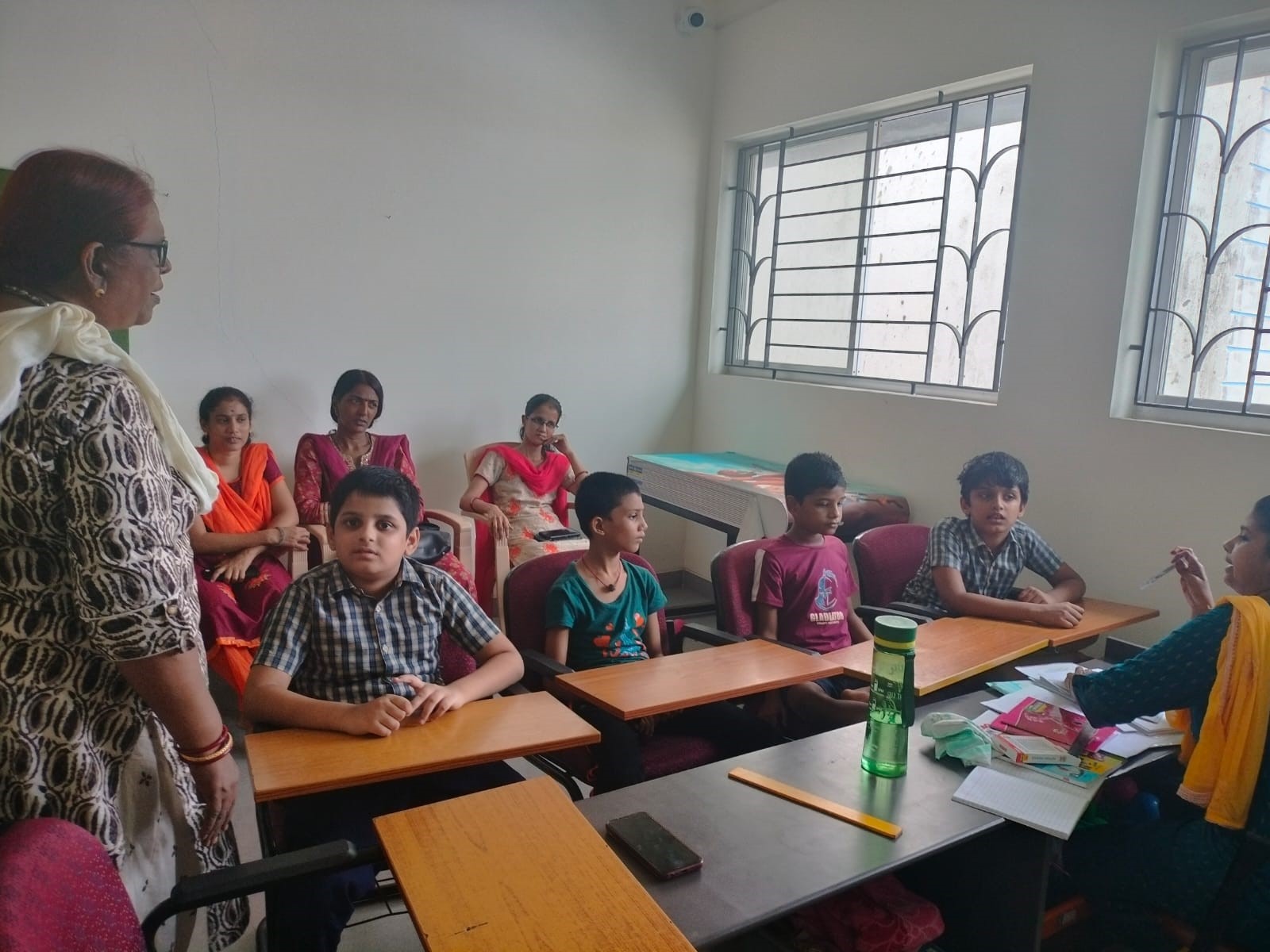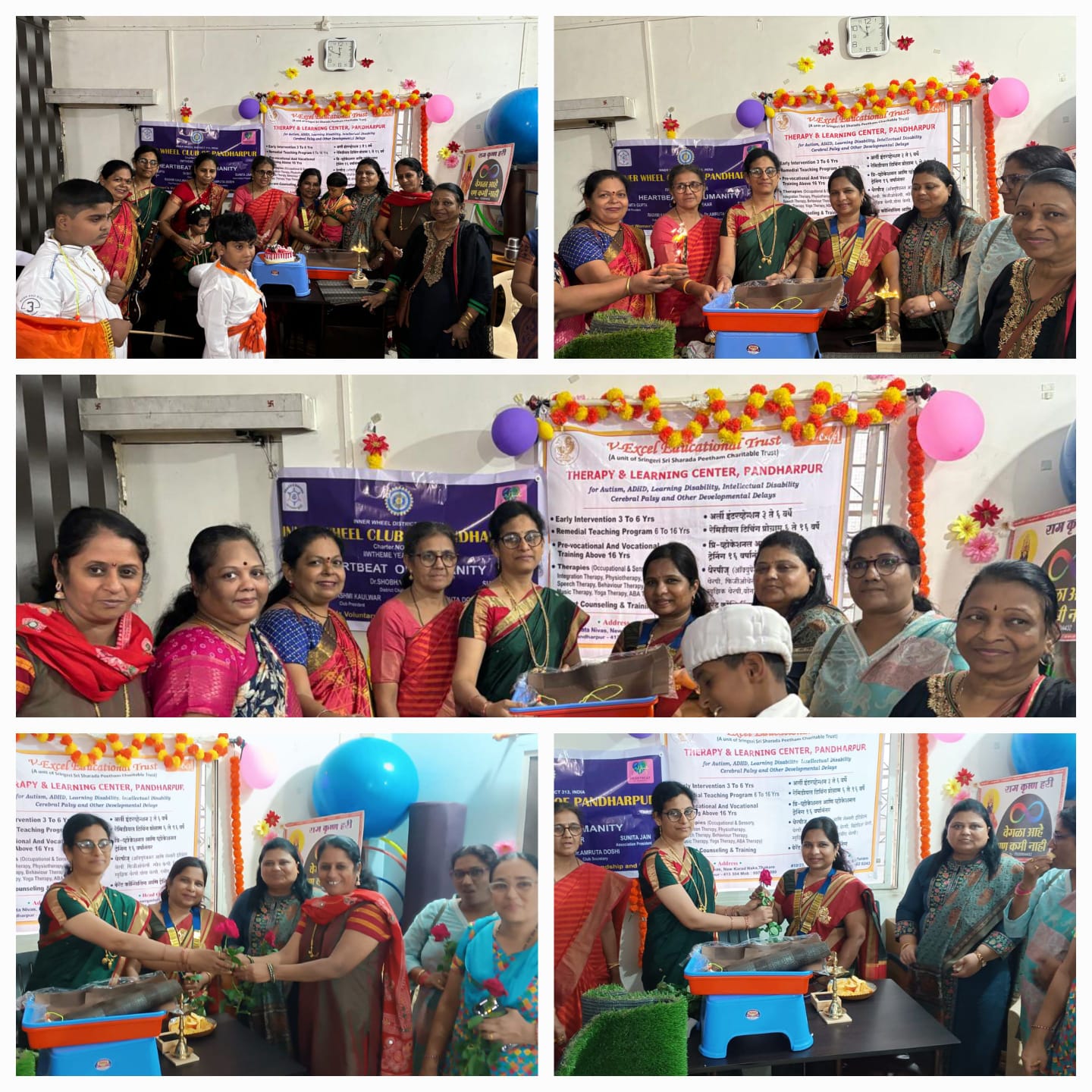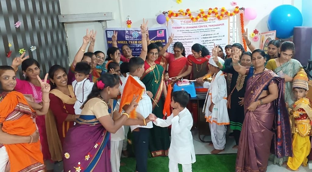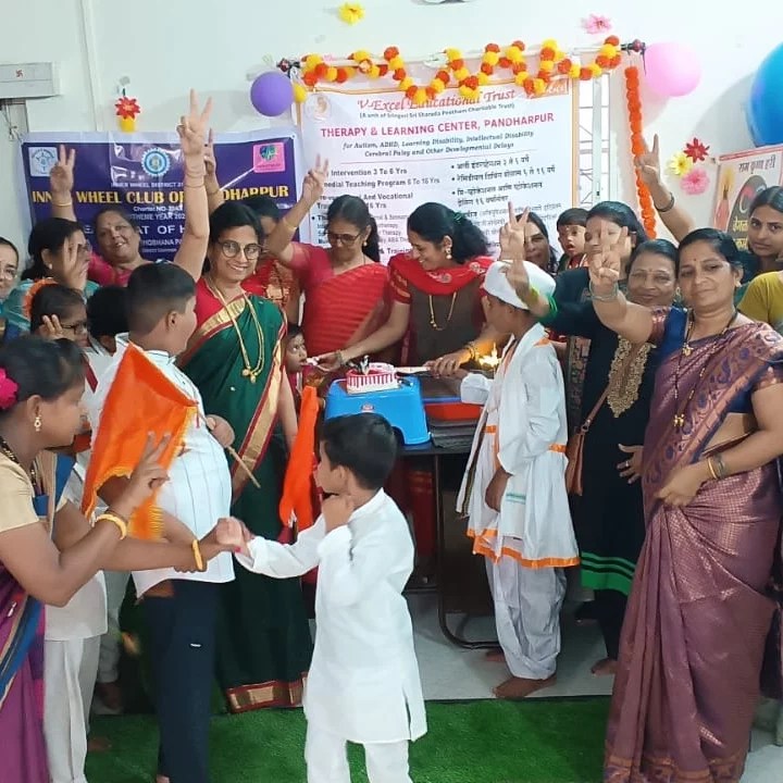 9th July 2023 is the foundation day of Pandharpur V-Excel center. Center organized a celebration on 9th July 2024. Honorable guests [President of Innerwheel Club and Head Mistress of Yashkirti Vidyalay] Mrs. Rashmi Kaulwar, Shreemati Geeta Utpat and other Innerwheel Club members were invited by the center coordinator, Rashmi Diwan. Club members celebrated this auspicious day with kids. They donated some useful sensory things and cut the cake with the children.