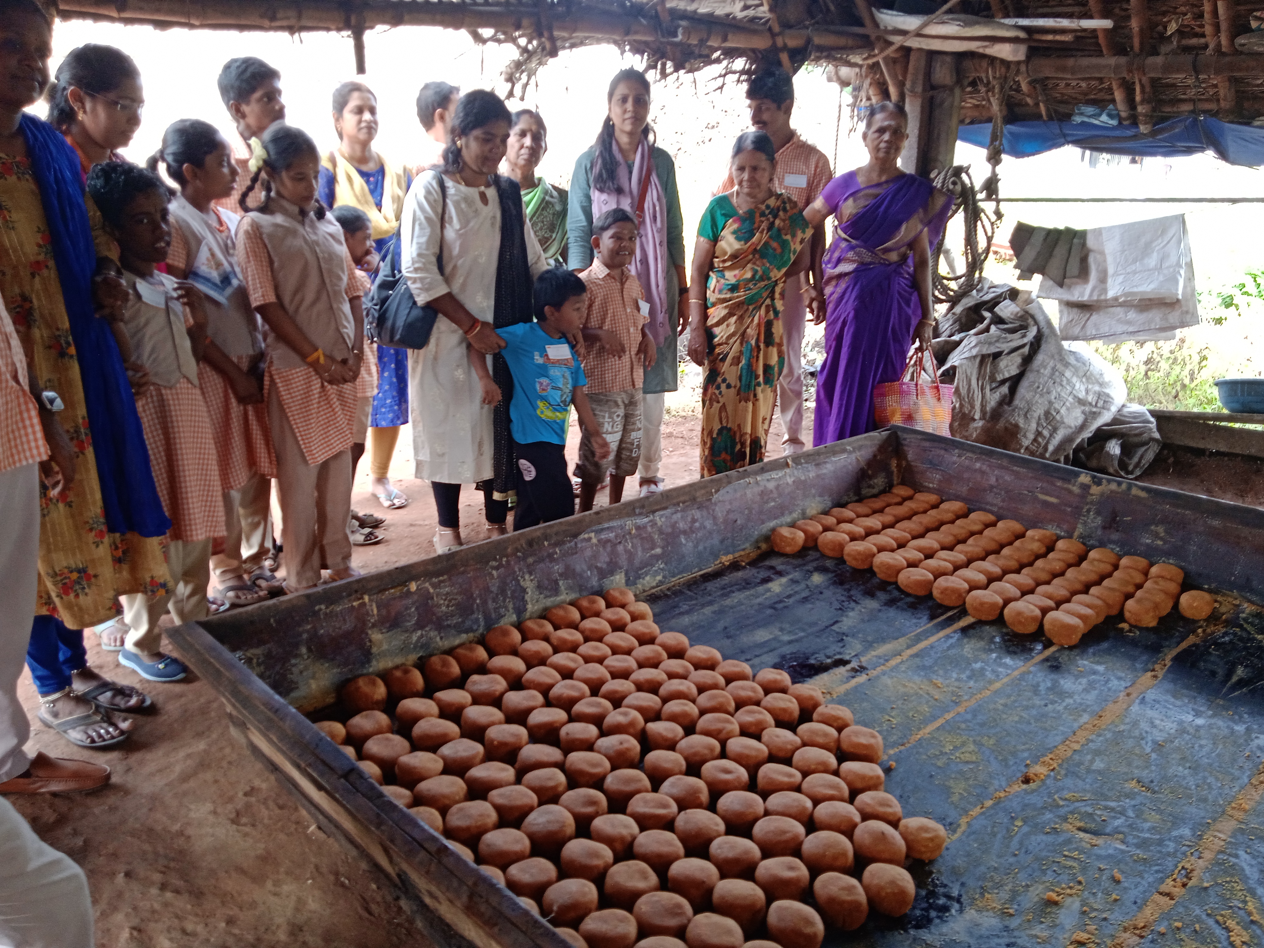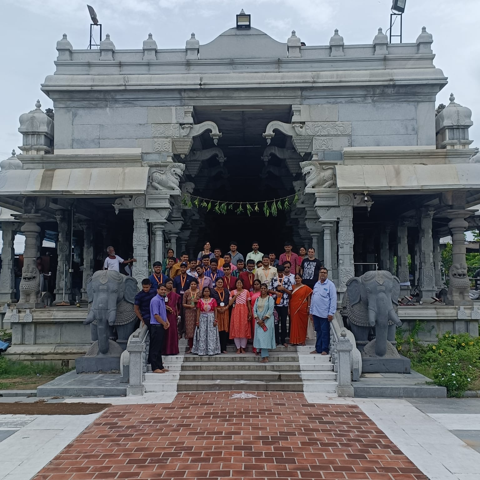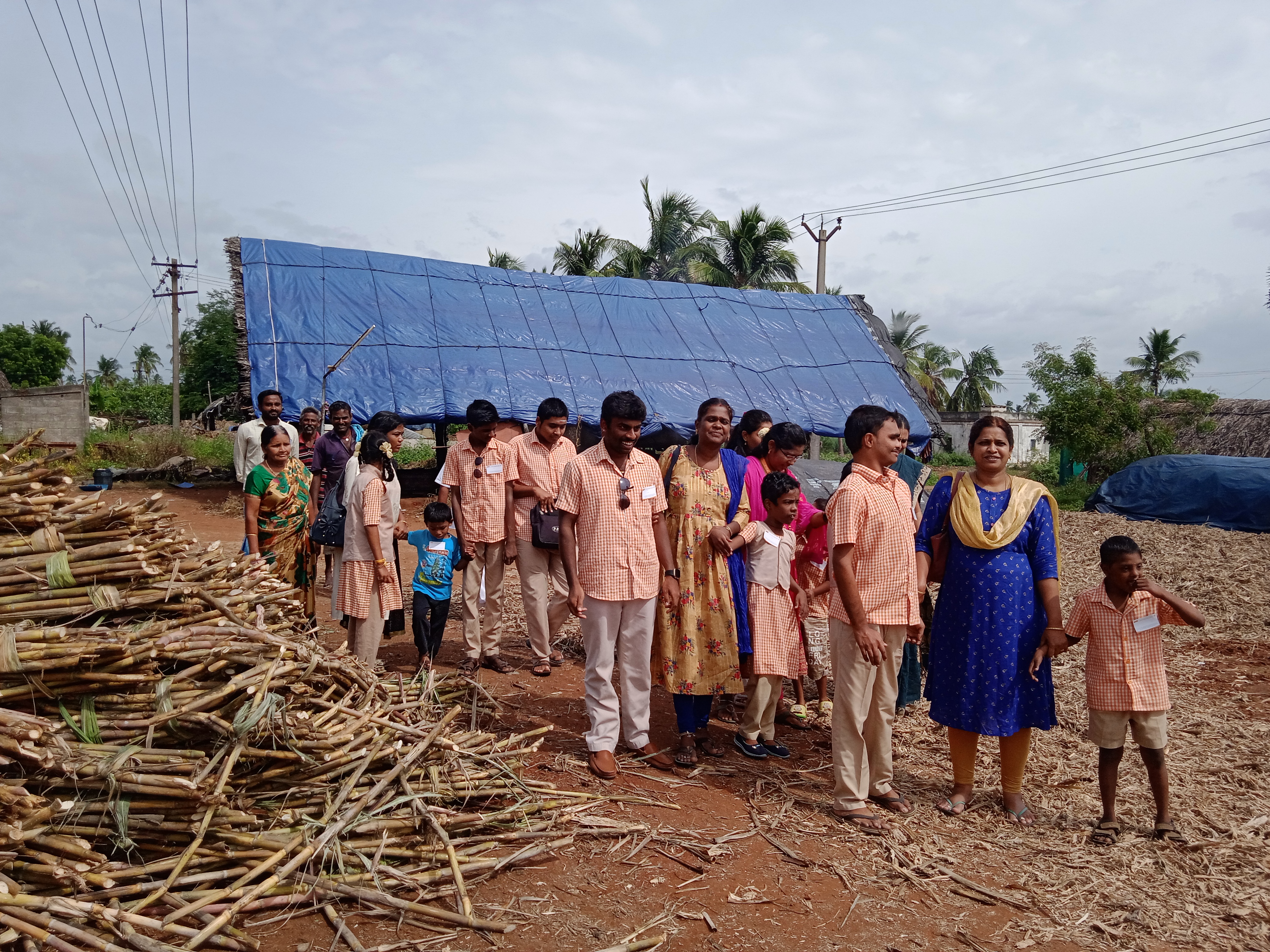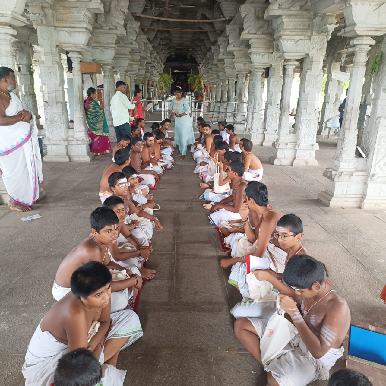 The YES team, comprising of 25 trainees and 13 trainers, went to Kanchipuram on Thursday, 11 July 2024 to mark our first field trip of the academic year 2024-25. The trip began with a visit to the Ayyampettai Weaver's Cooperative Society which featured traditional silk and cotton weaving setups. Our next visit was to the Manimandapam of Jagadguru Shri Chandrasekharendra Saraswati Mahaswamigal at Orikkai. We visited the temple and gurukulam and distributed small bags containing notebooks and stationery to all the gurukulam students. The bags and notebooks were produced at the YES centre. The gurukulam students chanted a few mantras and the Dhanvantri Slokam for the physical and mental well-being of our trainees.