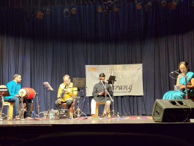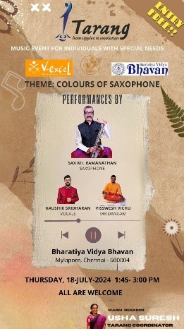 This month Tarang had Saxaphone, vocal and percussion performed by Shri. Ramanathan with a theme of Colours of Saxaphone. He played different instruments like flute, violin and Saxaphone with accompaniments artistes on Vocal Mr. Kaushik Sridharan, and on Mridangam Ms. Viswesh Vichu.