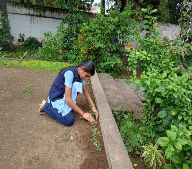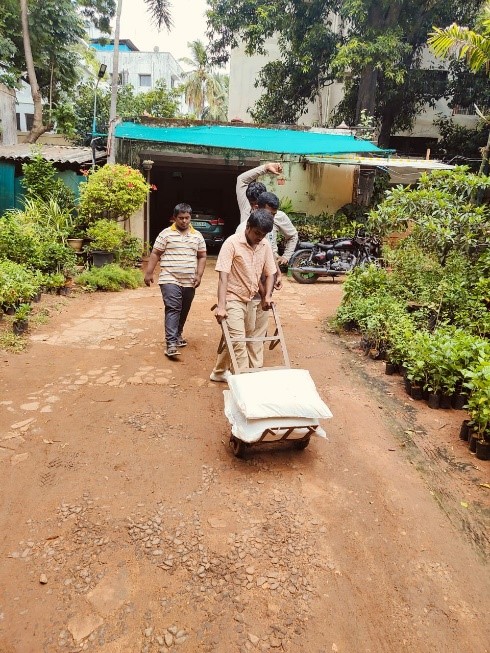 Gardening as a vocation is hard work where the students' water the garden maintained by them, every day in the morning and protect the saplings and plants from the harsh sun. They maintain the soil free of weeds by removing them periodically. Not only is this enough, but replenishing the soil is essential. So, they visited the nearby nursery and bought pre-mixed soil and some new plants. The students enjoyed the experience of selecting the plants and helping in moving the heavy sack of soil.