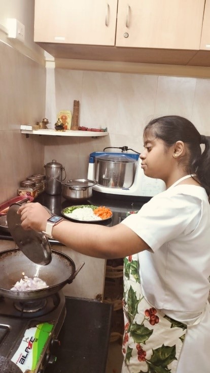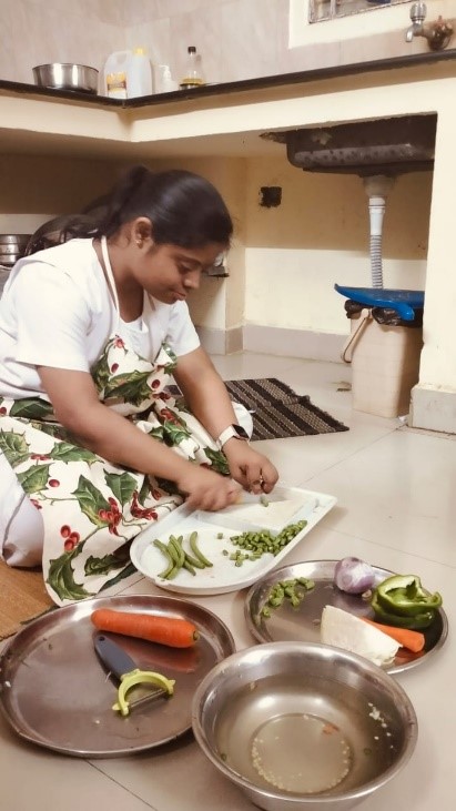 Making a student independent to fend for themselves completely, including cooking healthy and delicious food, is one of the main aims of KLC. In keeping with this we have been training students to cook independently, dishes like salads, soups, fried rice, rice and dhal with one vegetable. Niharikaa, one of our student's has started her training in the cooking vocation and is working well.