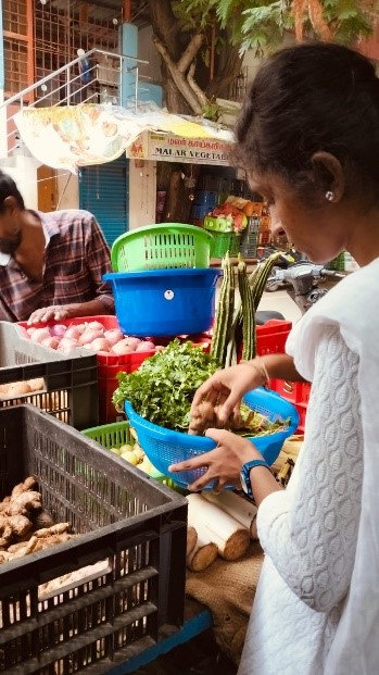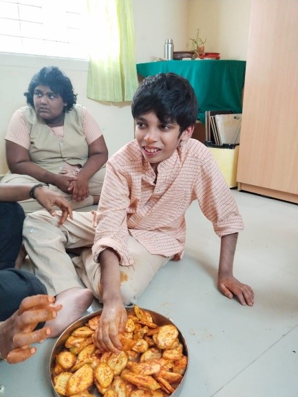 It is not enough just to identify the value of the rupee notes, shown to you. But it is important to know how and where to use it and this is where functional academics in our curriculum play an important role. In the newly started 3 to 5 program, teachers have been working with the students by taking them to the nearby vegetable shop and buying the vegetables needed for the next day in the kitchen. The list with the names of the vegetables and quantity is given to them and a teacher accompanies them. They read the list, select the appropriate vegetable and quantity, and take it to the counter for billing. Here the students use a calculator to total the bill, give the appropriate amount of cash and take back the change. When done repeatedly, it becomes easier for the students to do this independently.