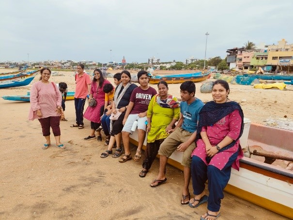 The highlight of this month's field trip was the presence of 18 employees from Grundfos who came along and developed new friendships with our trainees. Forty of us went in two vans to the Santhome Church and then to the Lighthouse on Marina. There was joy and fun in the vans. At the Santhome Church, a nun explained about the tomb of St. Thomas. Each trainee was a ‘best buddy' from the Grundfos team.