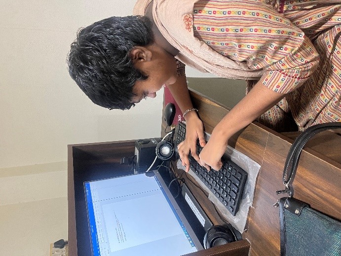 • Ms. Sudha Sruthi Saravana, who is pursuing B. Ed Special Ed through TNOU, joined VTU for internship and started working with our trainees. She training them in computers by making them use Canva app to create invitations and cards. Founder’s Day invitation content was given to her, to train Sousan and Rithwik. She also created tools to train Meenakshi in bead work.