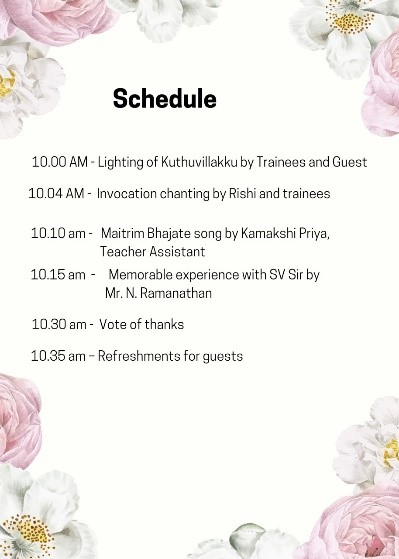 The event started by chanting lead by Rishi with trainees and song rendered by Ms. Kamakshi Priya, who sang SV Sir’s favourite song ‘Maitrim Bhajate.” Dr. Vasudha spoke and thanked Mr. N. Ramanathan for sharing and how grateful V-Excel was to associate with ESVI Sarada Foundation.