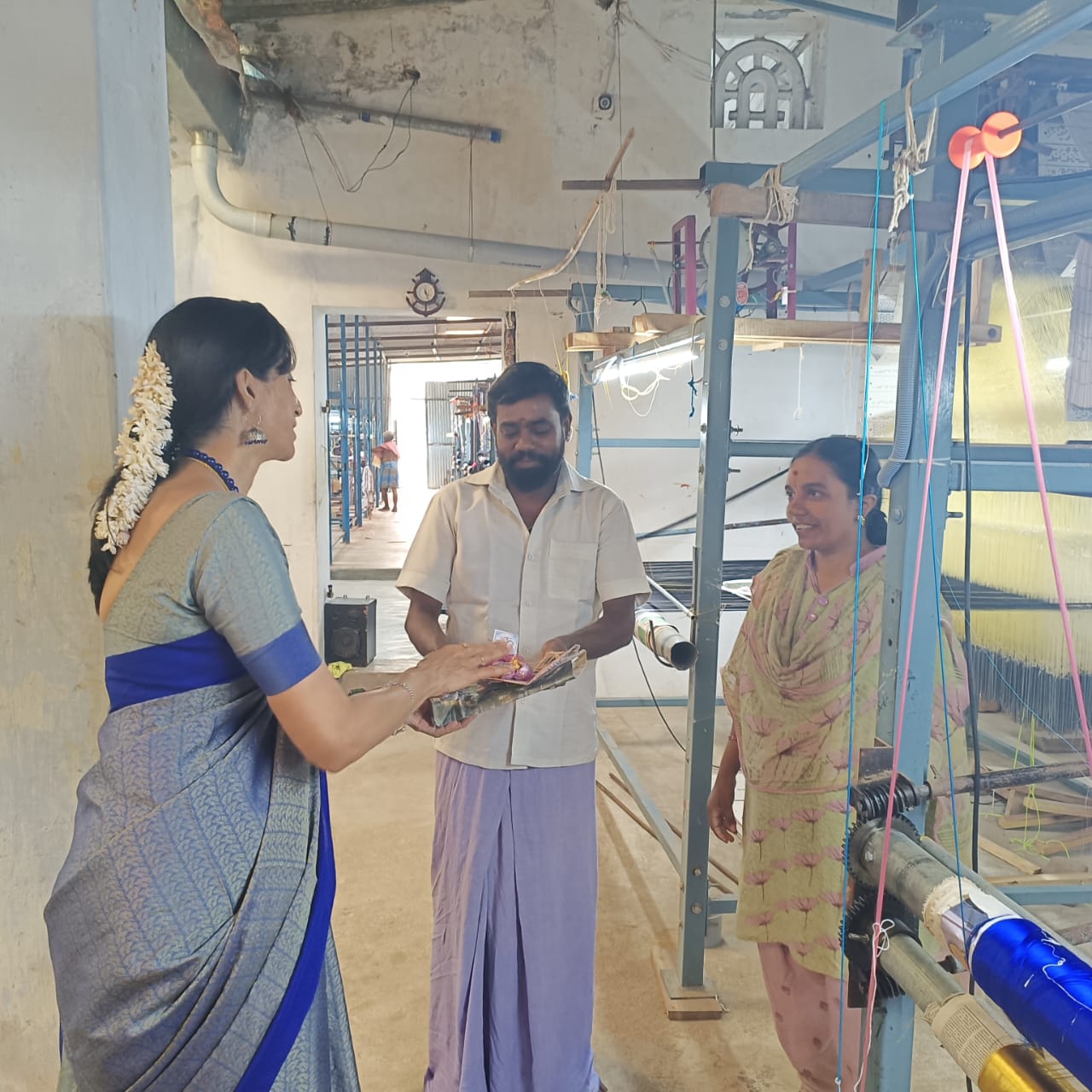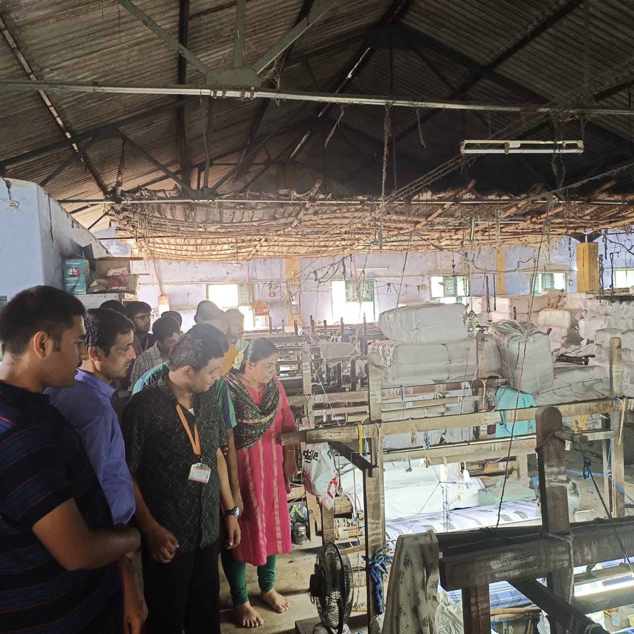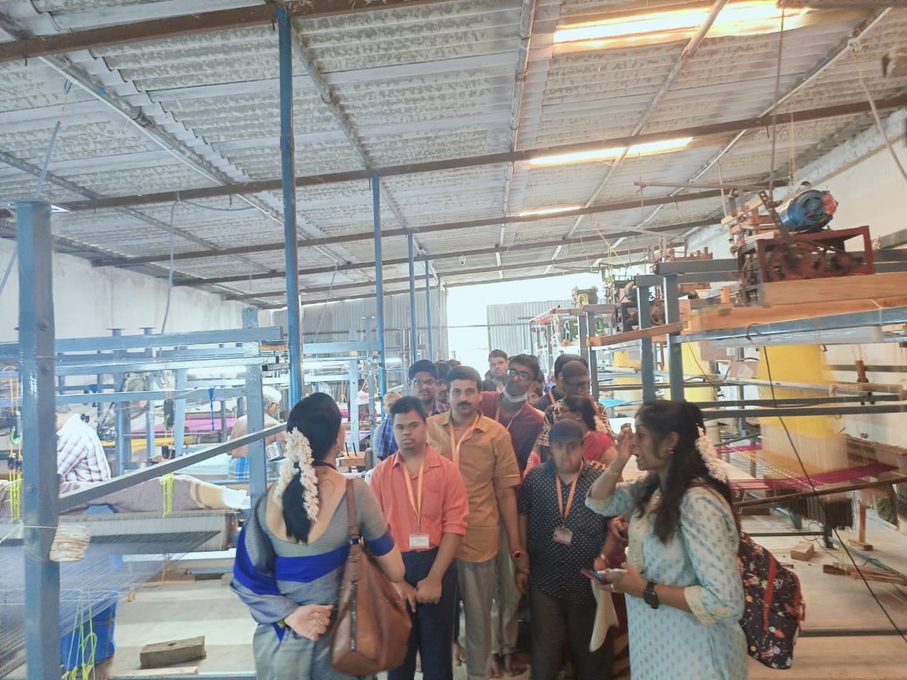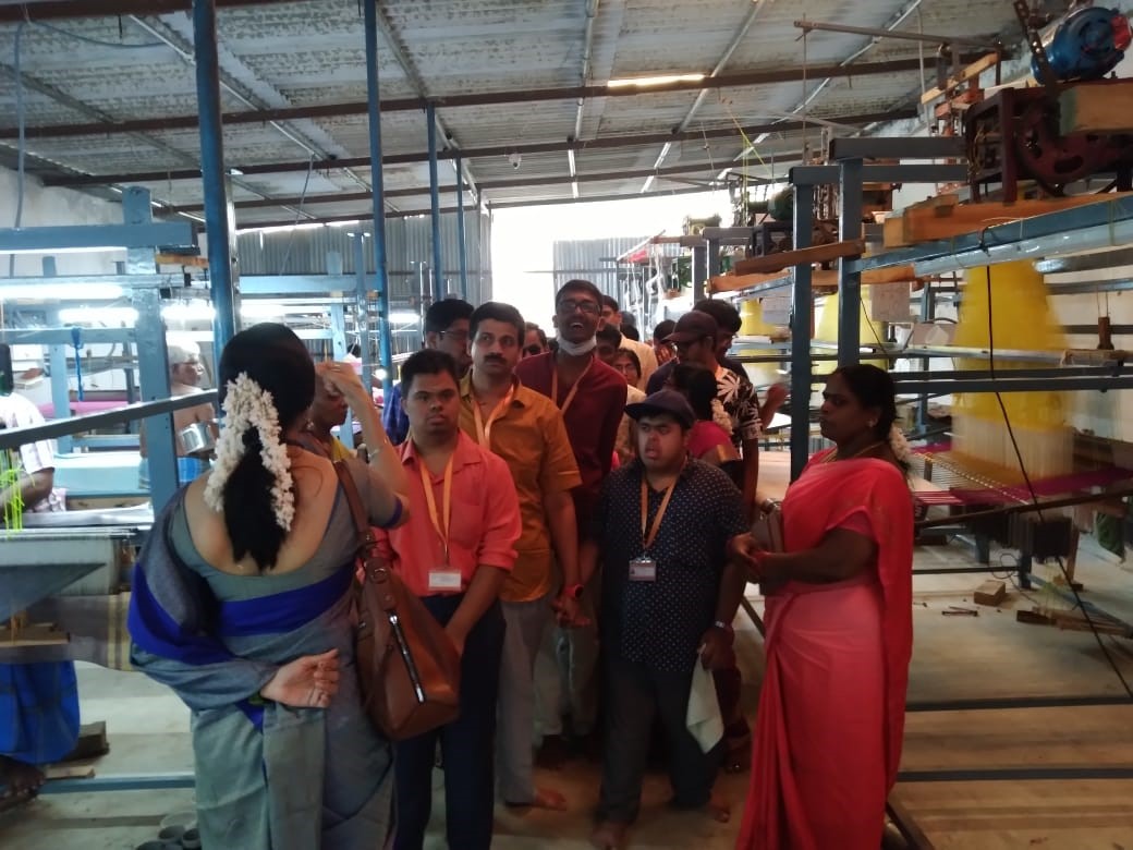 We then went to the Silk Park in Kanchipuram where we visited the mechanized loom facilities of Shree Ramkumar Silks. The proprietor, Mr. Rajendran, interacted with our trainees and his team explained the process of weaving, designing, and packing silk sarees.