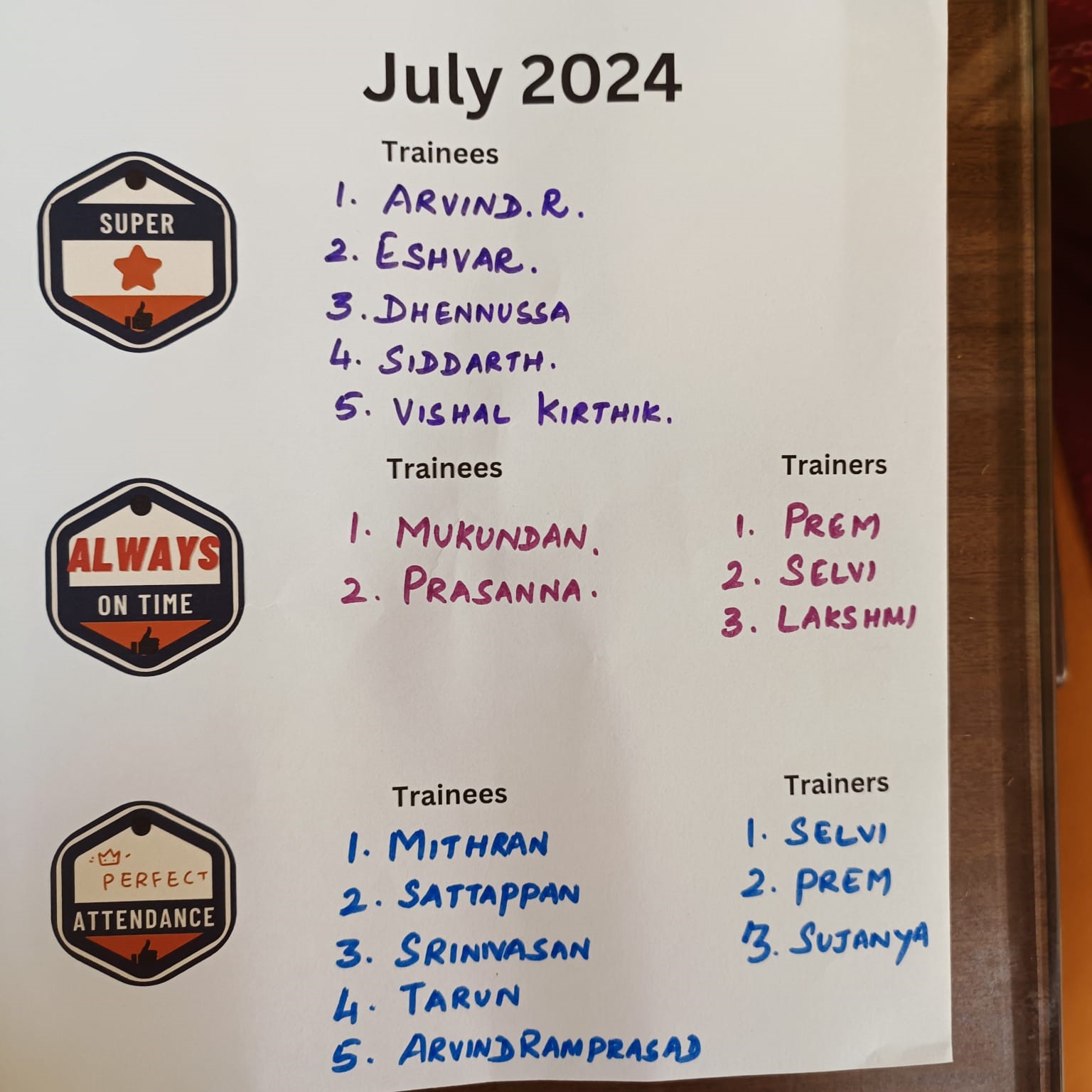 We have given badges which they will carry for the whole month and return it on the last day of the month. On the 1st working day of every month, trainees will be selected under each category and badges will be given. This will motivate to push themselves further towards a progressive path.