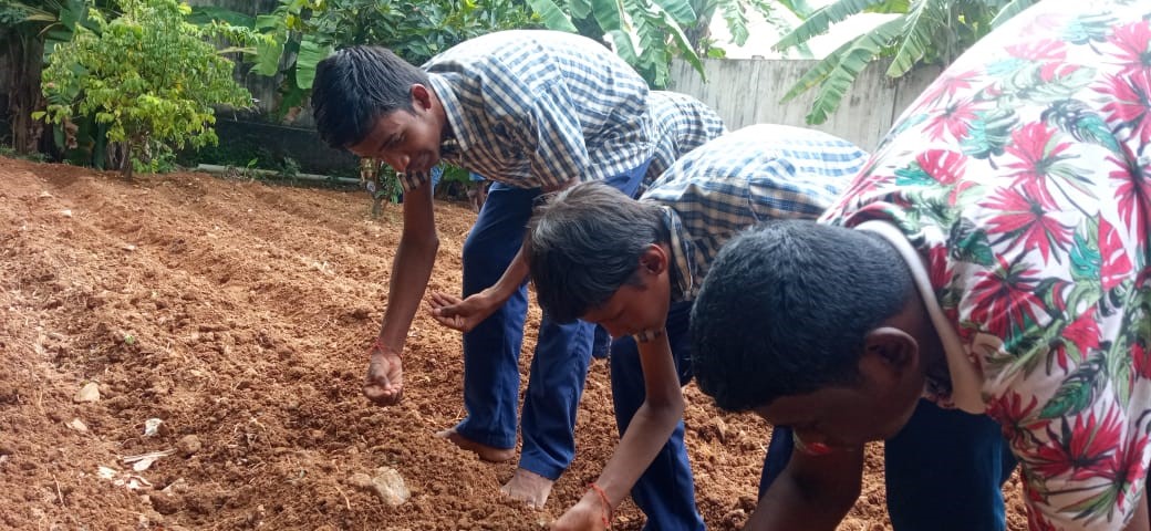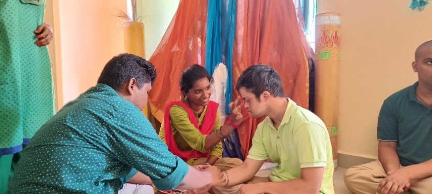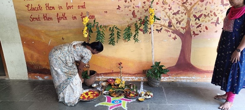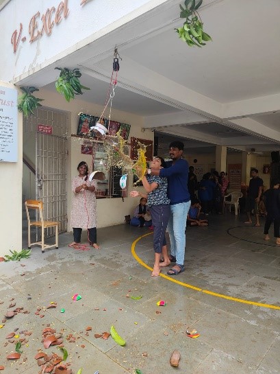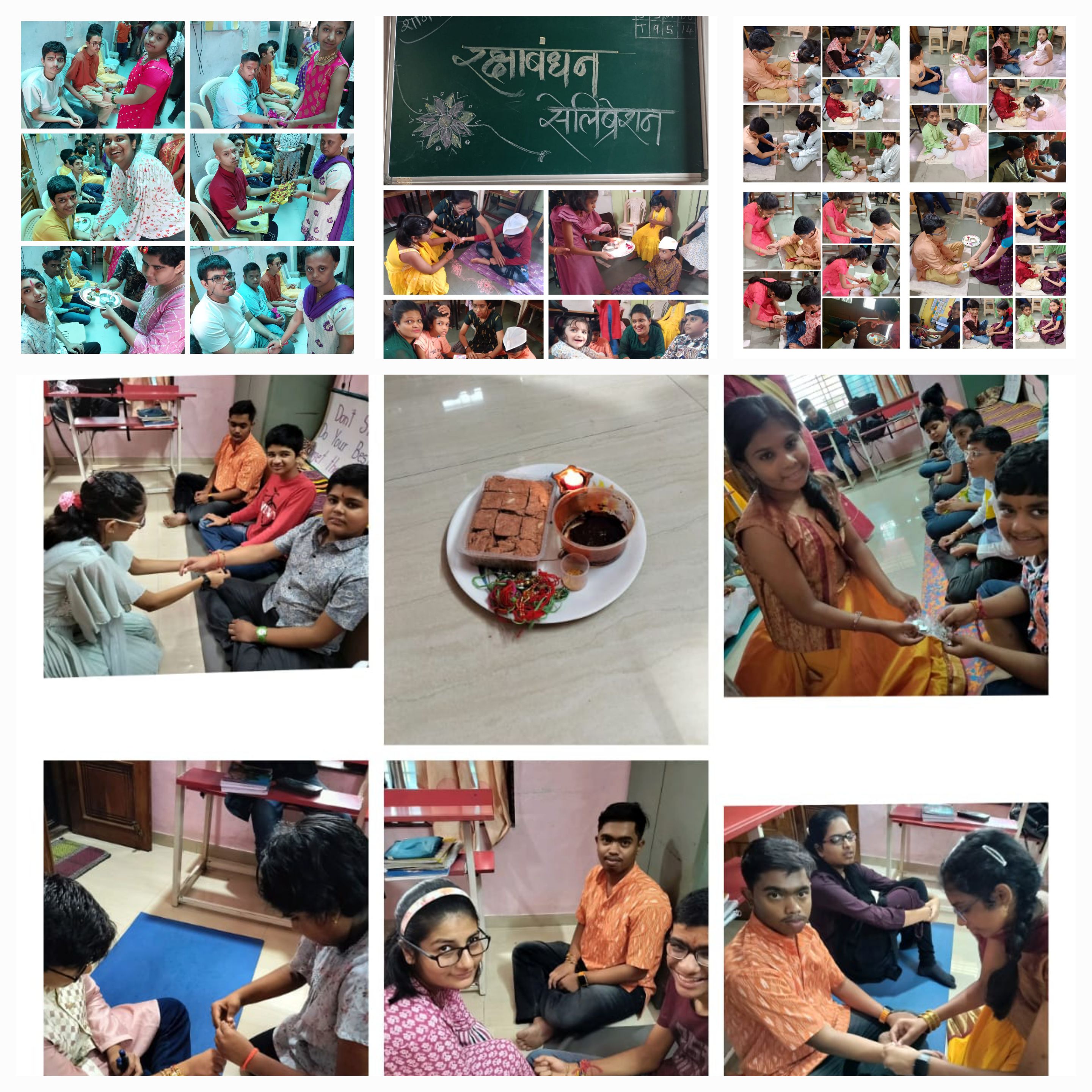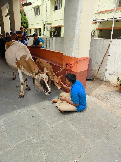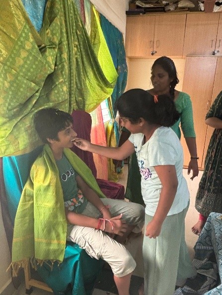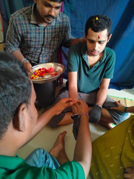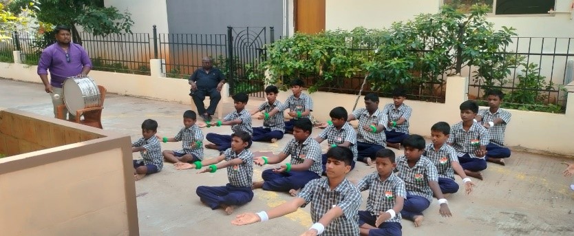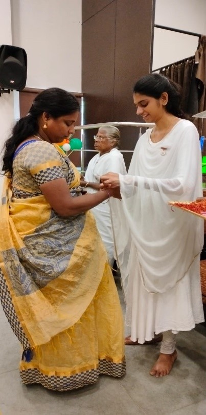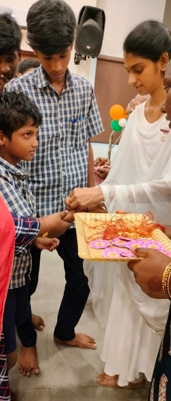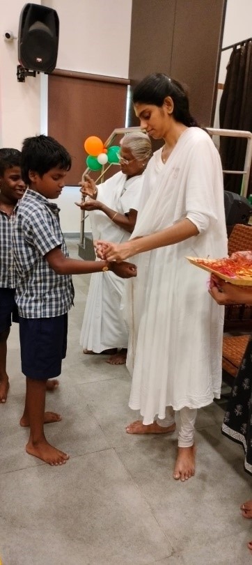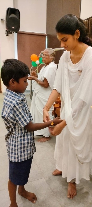 Raksha Bandhan the celebration of brotherhood among the students, teachers and staff happened with simple Rakhis made by the students and being tied on the wrists, along with applying sandal and kumkum on the forehead, and blessings with flowers and sacred rice, completed with feeding ragi laddoos with jaggery. The promise to protect, cherish, love and care for each other was again reiterated through this process.