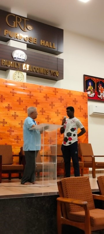 Special thanks to Mr. Vijayakumar and Ms. Prabha Vijayakumar, parents of trainee Ashwin Vijayakumar (VTU) who are members of The Mylapore Club and who helped us arrange the hall and lunch.