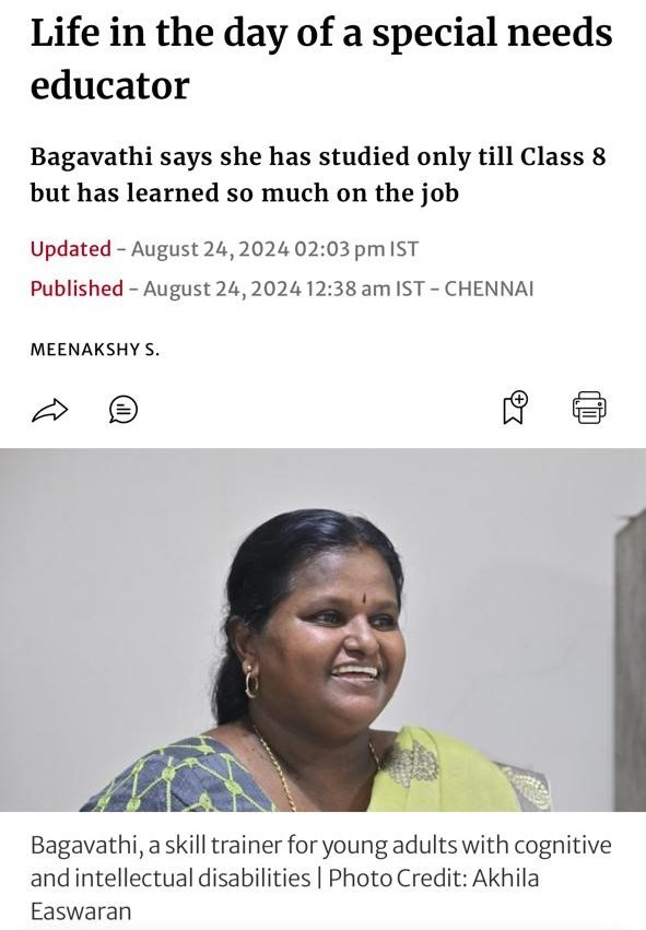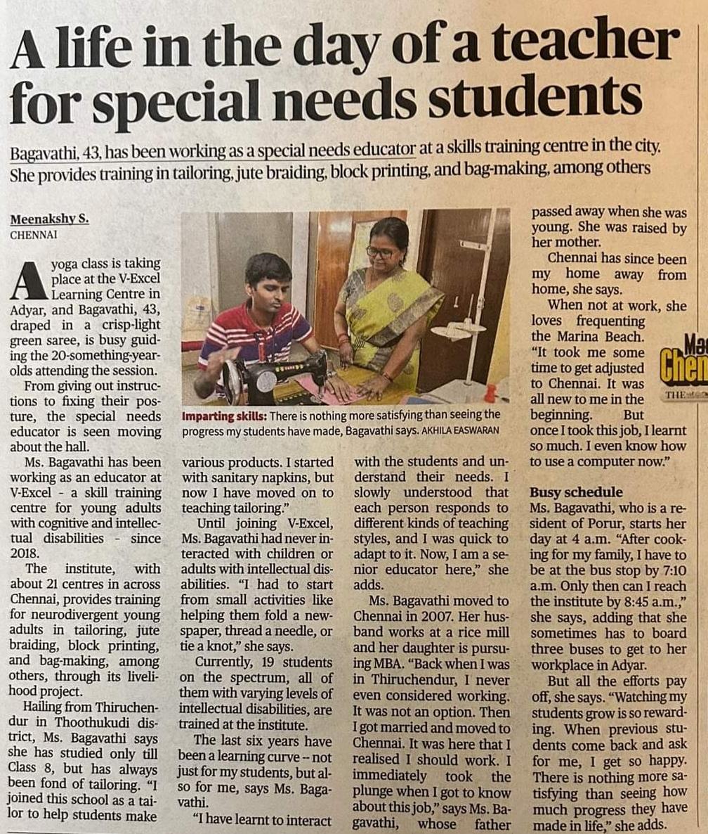 Reporter Meenakshi from The Hindu approached Charu for an interview with a skill trainer who works with special needs. This was for the Madras Week and the topic was ‘A Day with Skill trainer/Special Educator’. Bhagawathi was recommended and Meenakshi interviewed her. The article was published in The Hindu on 24th Aug 2024.
