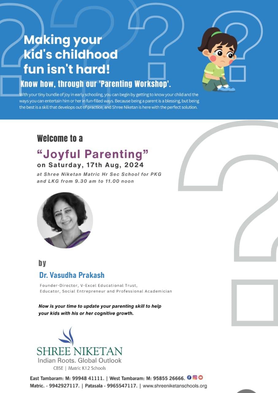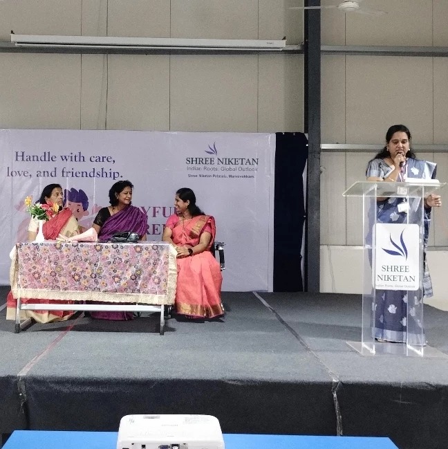 Dr. Vasudha Prakash, Founder-Director of V-Excel, was invited to speak on "Joyful Parenting" at the Shree Niketan Matriculation Higher Secondary School, Tiruvallur, Chennai.