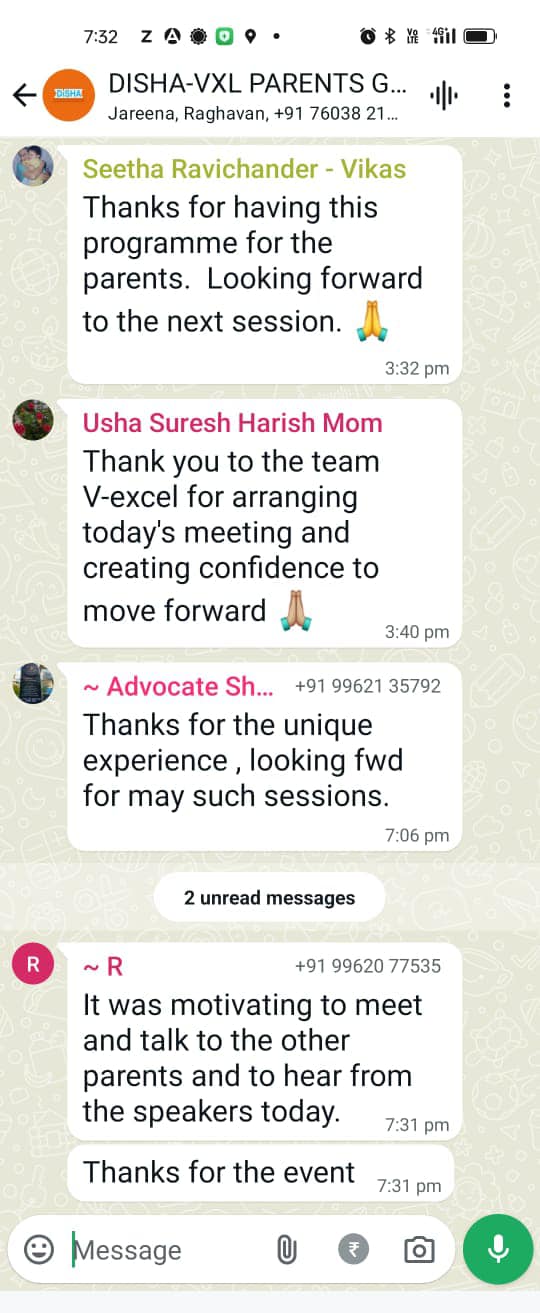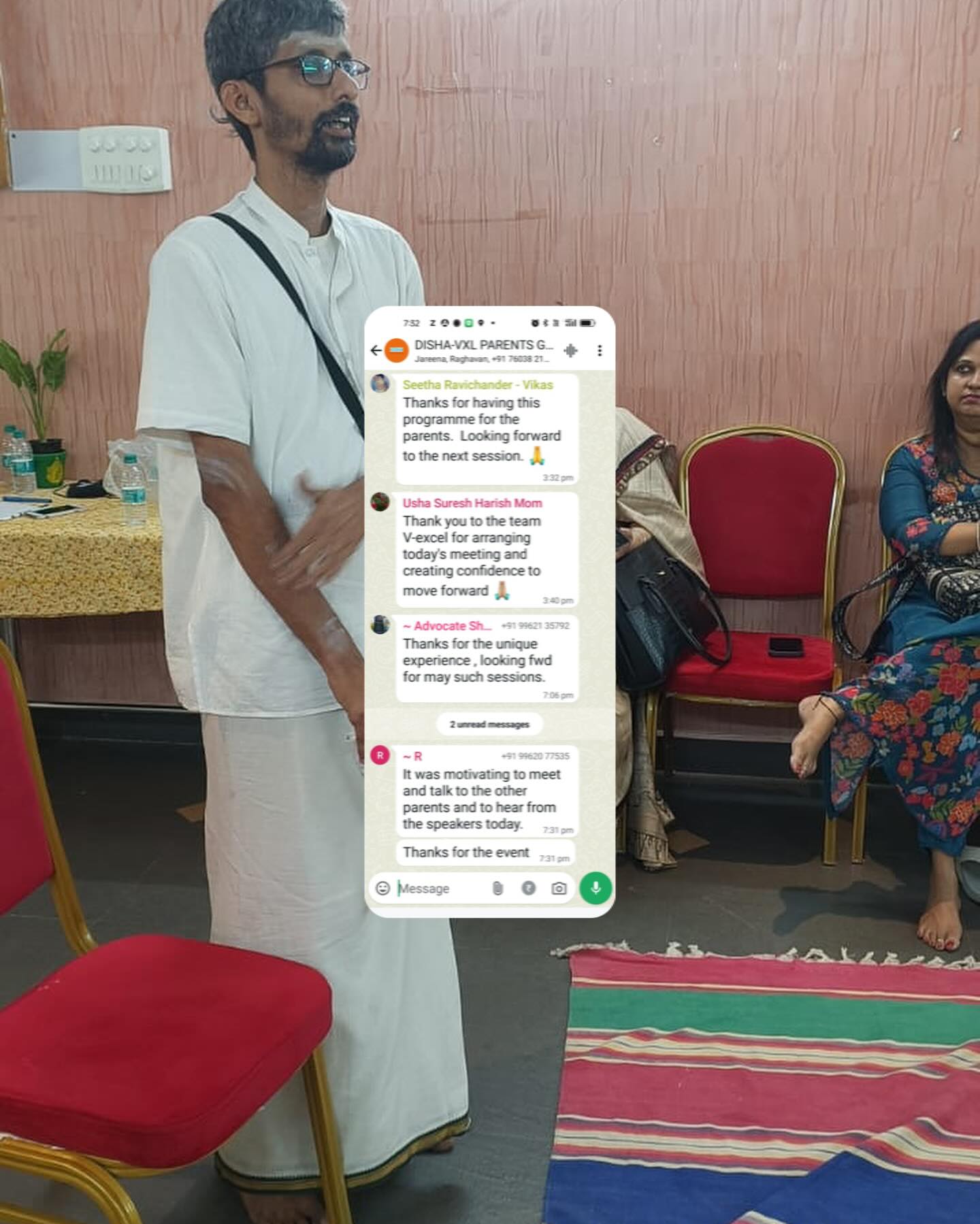 • Charu along with Gayathri conducted Disha Parents Meet on 10th Aug 2024 at The Mylapore Club. 35 parents from across the units participated and from VTU 10 parents attended. Ms. Radha Ramesh, Proprietor of Twin Twigs and mother of special need young adults was the speaker. Charu gave the welcome address followed by speech from Dr. Vasudha and the guest. Gayathri conducted the panel discussion with parents. It was a wonderful start for this year. Parents were very happy, lot of information and details were discussed. Prof. Anand spoke about legal guardianship and Government schemes.