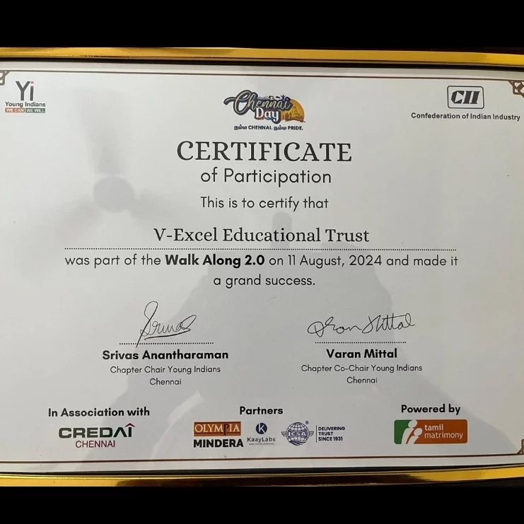 From V-Excel 36 trainees and students from KLC, YES and VTU participated along with 17 teachers, trainers, staff and parents. The walk covered a distance of 600 metres and was flagged off by Mr. A.R. Unnikrishnan, Vice Chairman, CII Tamil Nadu; Mr. Ajit Chordia, CII Vice Chairman, Chennai Zone; and Mr. A. Mohamed Ali, President, CREDAI Chennai.
