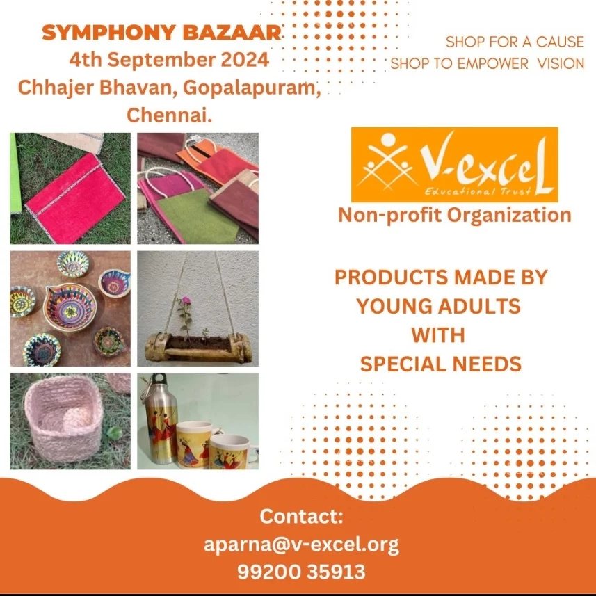 V-Excel will have a stall of products made by our trainees, amongst a variety of other stalls @ Inner wheel Club of Chennai Symphony's Bazaar in Chhajer Bhavan on Wednesday, September 4th, 10 am - 8 pm. Please be there in large numbers to shop, support our trainees and do help spread the word.