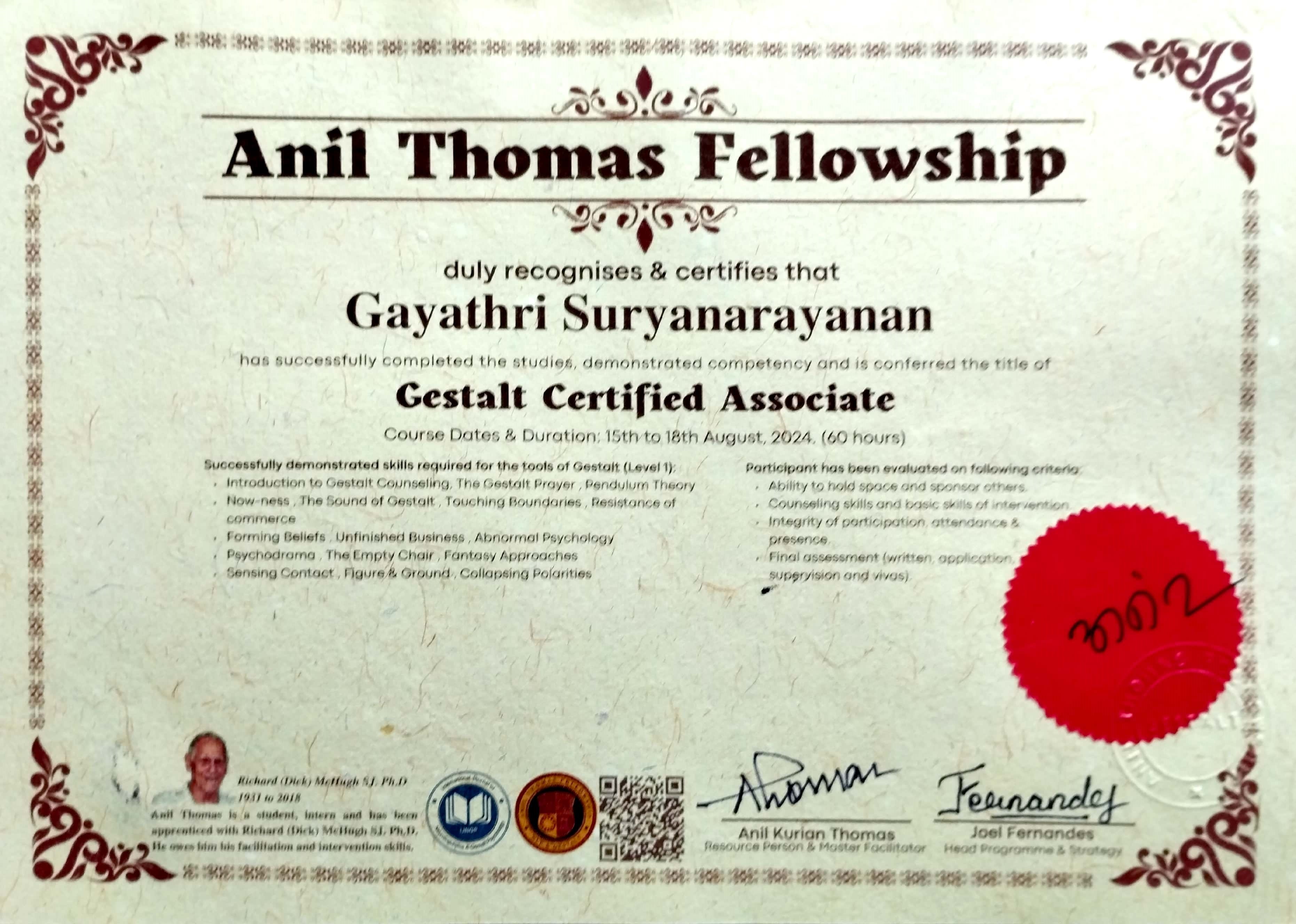 Gayathri Suryanarayanan from YES completed the Associate certification in Gestalt Psychology from Anil Thomas Fellowship Program. It was 60 hours virtual program from 15 August to 18 August. The program included self-work, therapy sessions and a written integration. The same was evaluated by moderators and the scoring was done based on those evaluations.