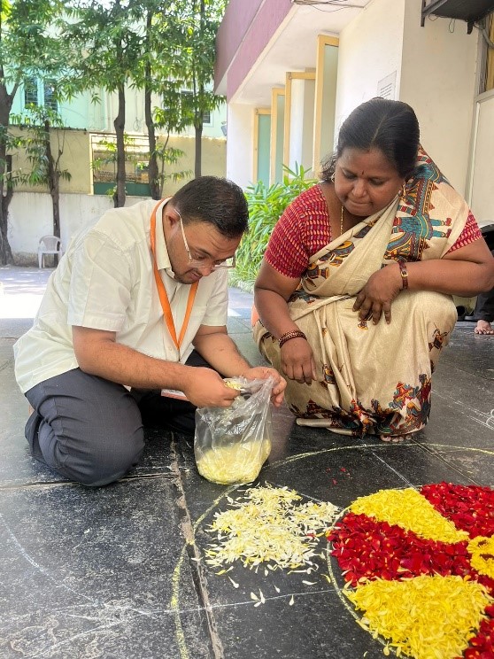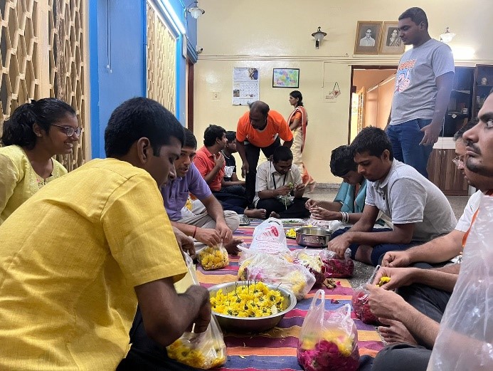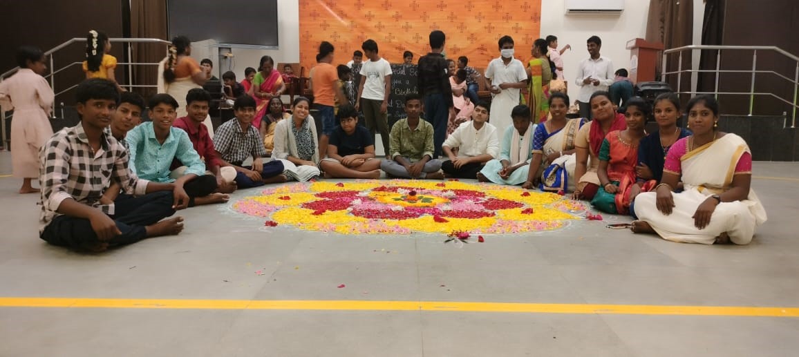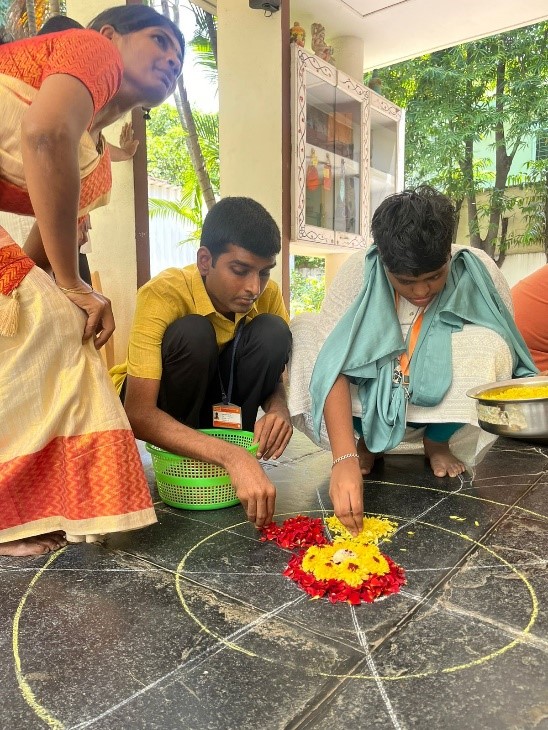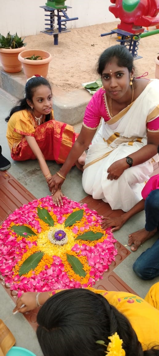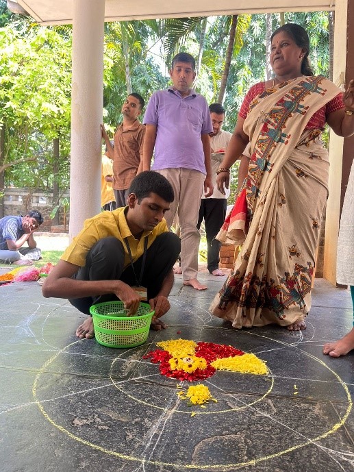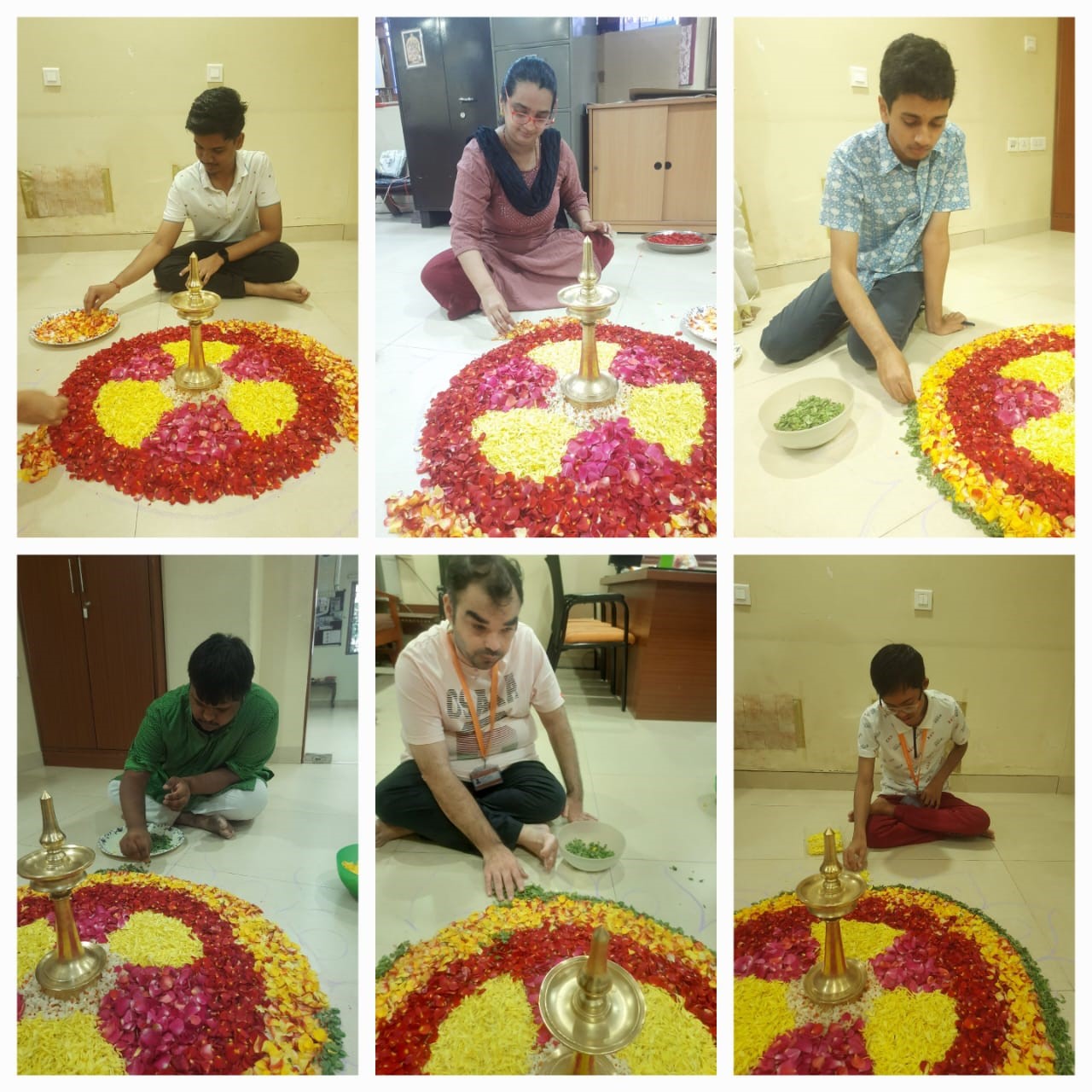 All the trainees brought flowers and a Pookalam was made as part of the Onam celebrations on 14th Sept. Trainees were made to sort the flowers based on the colours, teachers Savari and Jayanthi drew the rangoli along with trainee Sousan and Vishal. All trainees were given small portion of the rangoli to fill with flowers. They enjoyed and we all danced around the same.
