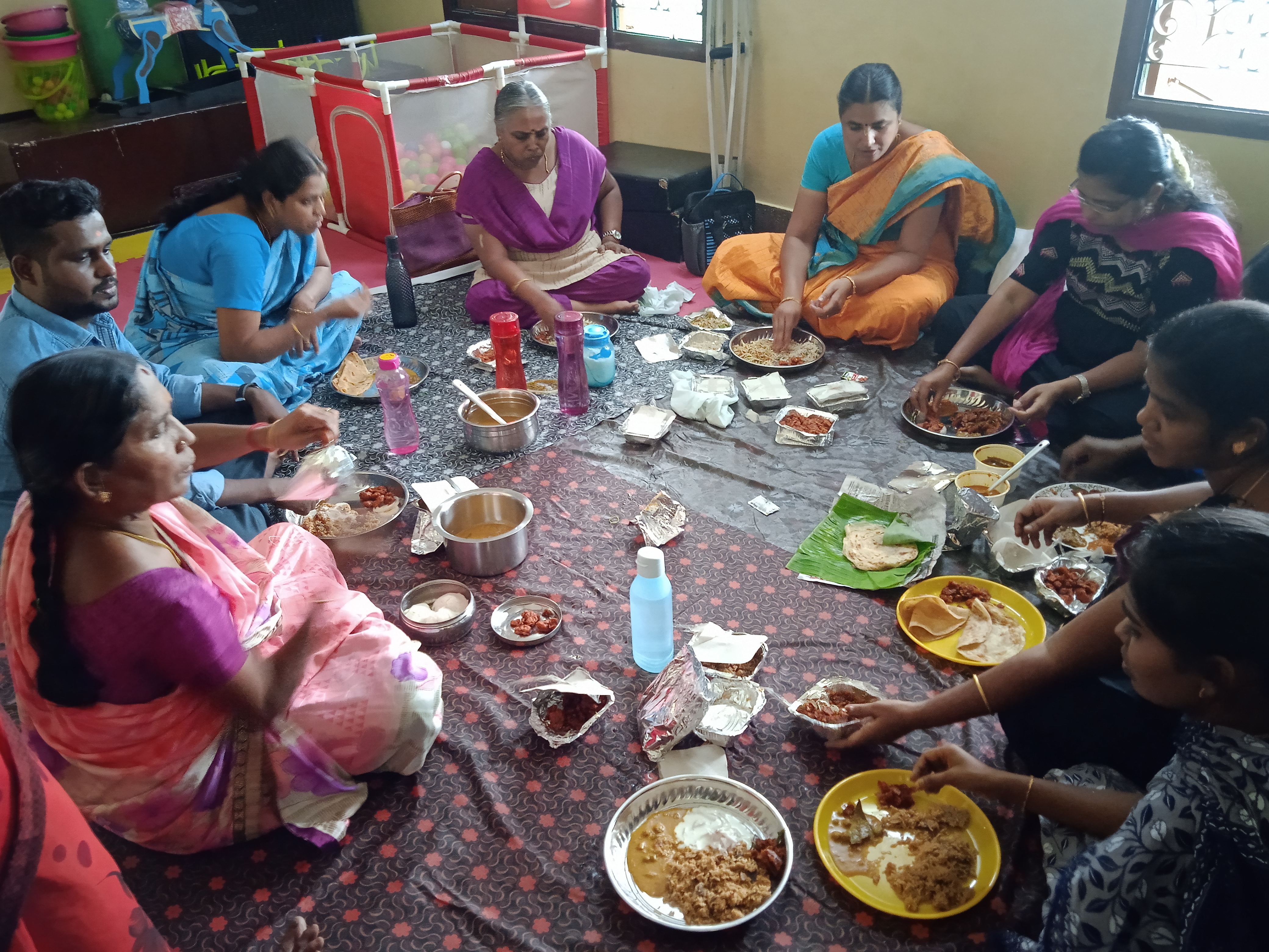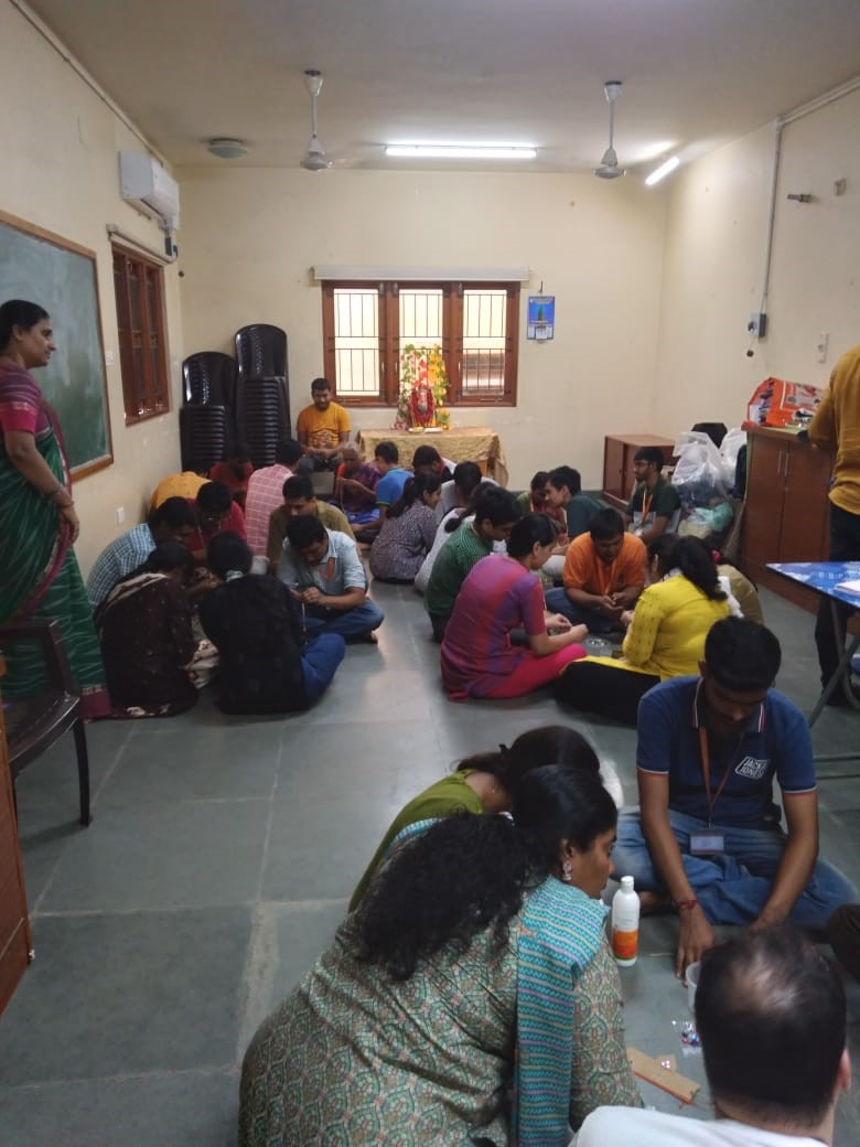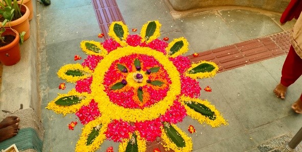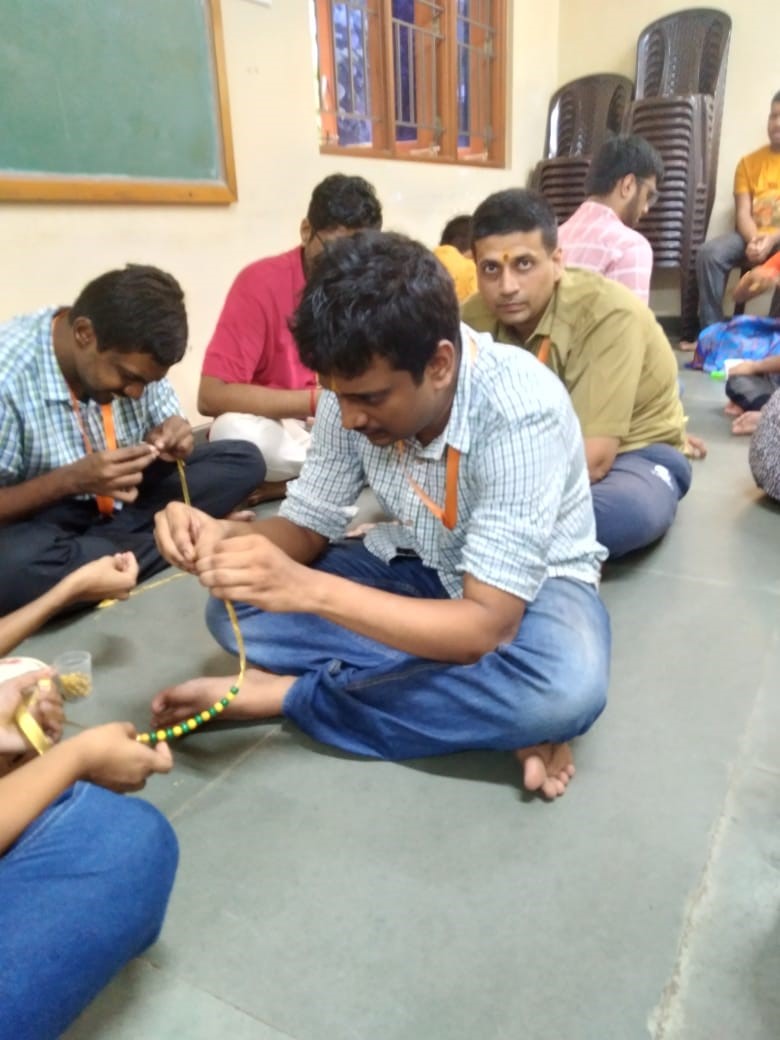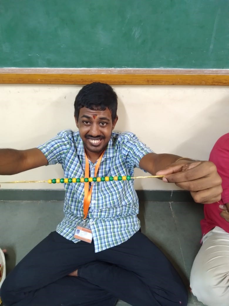 All the trainees brought flowers and a Pookalam was made as part of the Onam celebrations on 14th Sept. Trainees were made to sort the flowers based on the colours, teachers Savari and Jayanthi drew the rangoli along with trainee Sousan and Vishal. All trainees were given small portion of the rangoli to fill with flowers. They enjoyed and we all danced around the same.