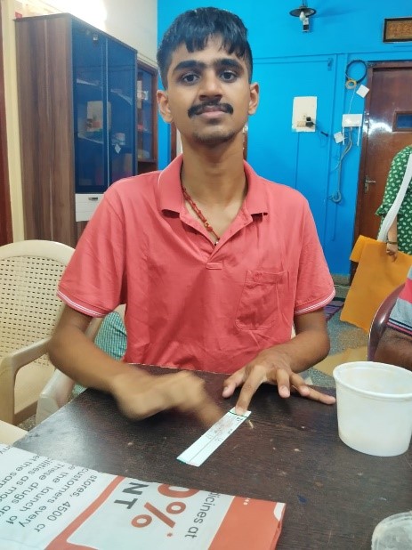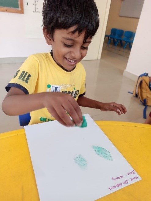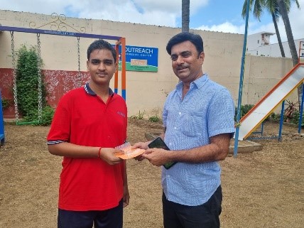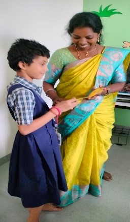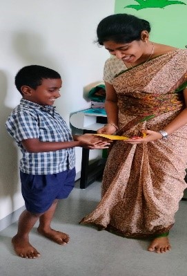 For him to engage in gross motor tasks, Seetha ma'am used physical boundaries (rings, planks, or bricks) to help regulate his hyperactive behavior, where he is to engage in the activity only within the bounds of the marking. Shashaank dislikes writing and needs a lot of encouragement and motivation to engage in the task. Seetha ma'am gives him plenty of high fives and praises, acknowledging his progress at every turn.