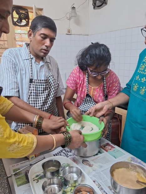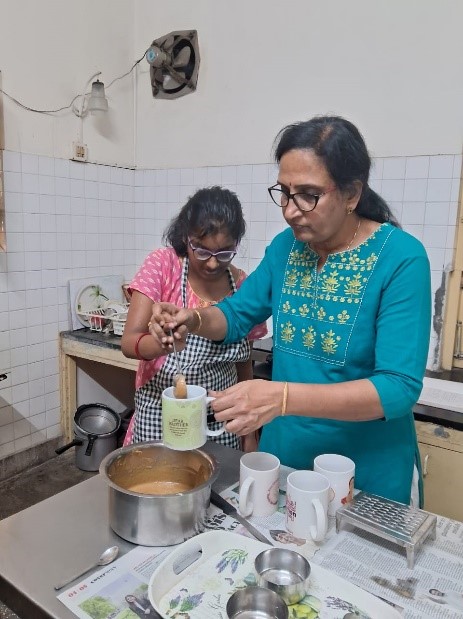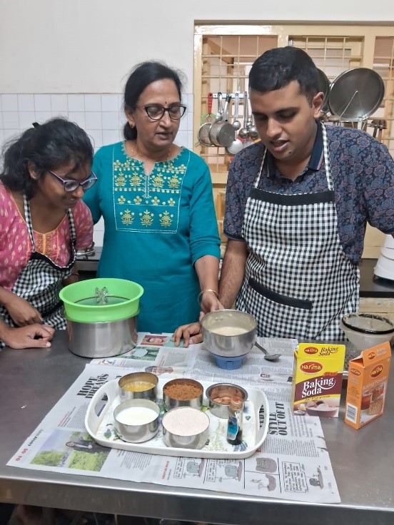 • Apart from making tea and kanji, new activity of making cupcakes using wheat, jaggery and banana was taken on. Initially volunteers and trainer did trial run and two trainees were assigned for the training. They were able to identify the ingredients, measure, mix, grind and bake.