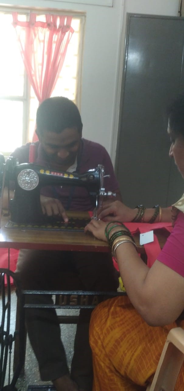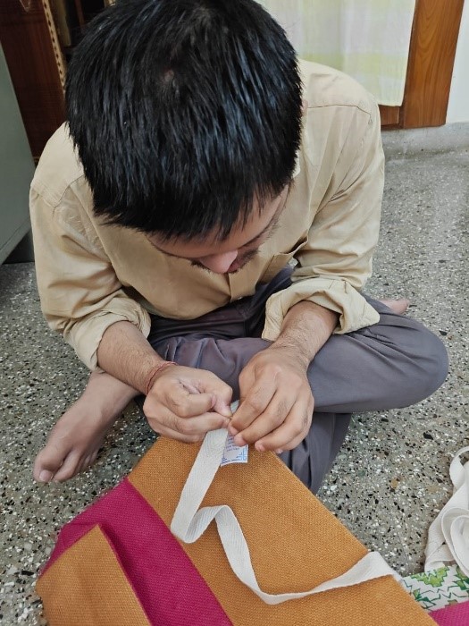 • Jute double colour bags material was measured using template and were cut by the trainees. Two trainees were engaged in stitching the bags. Tags were done by all the trainees.