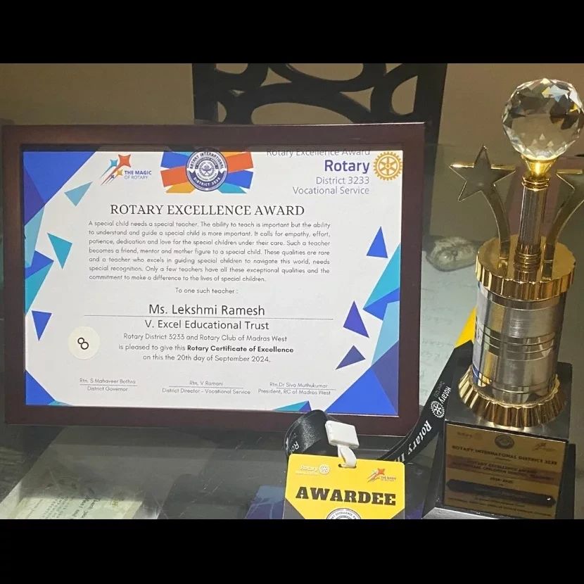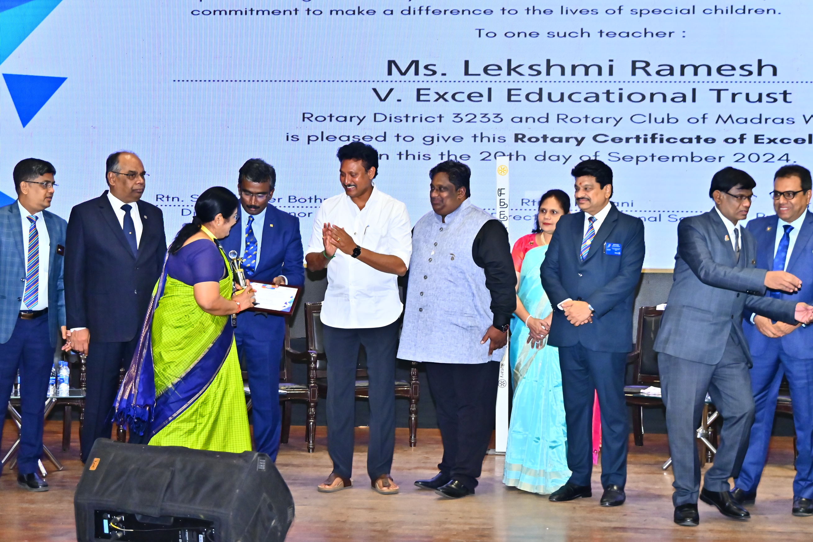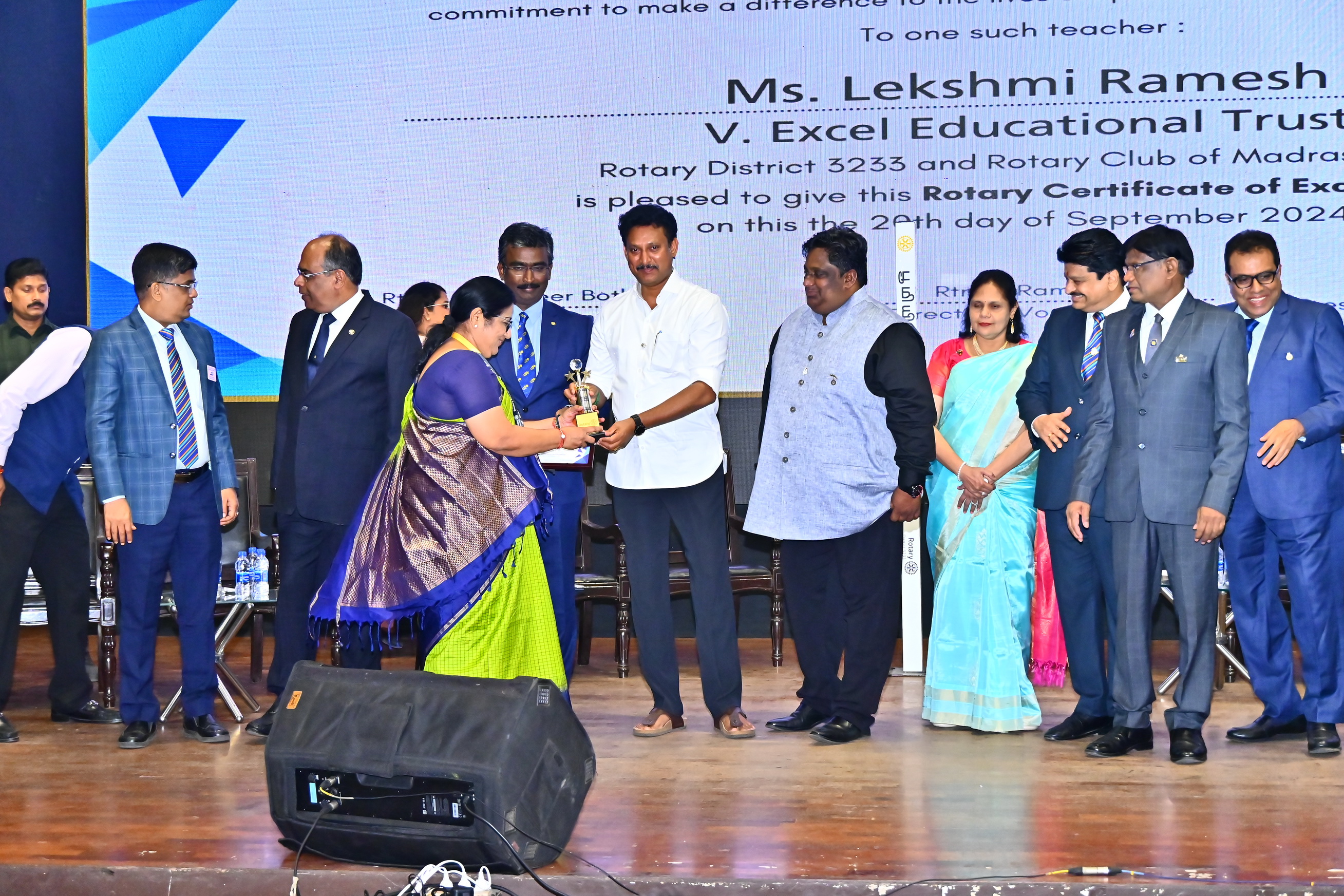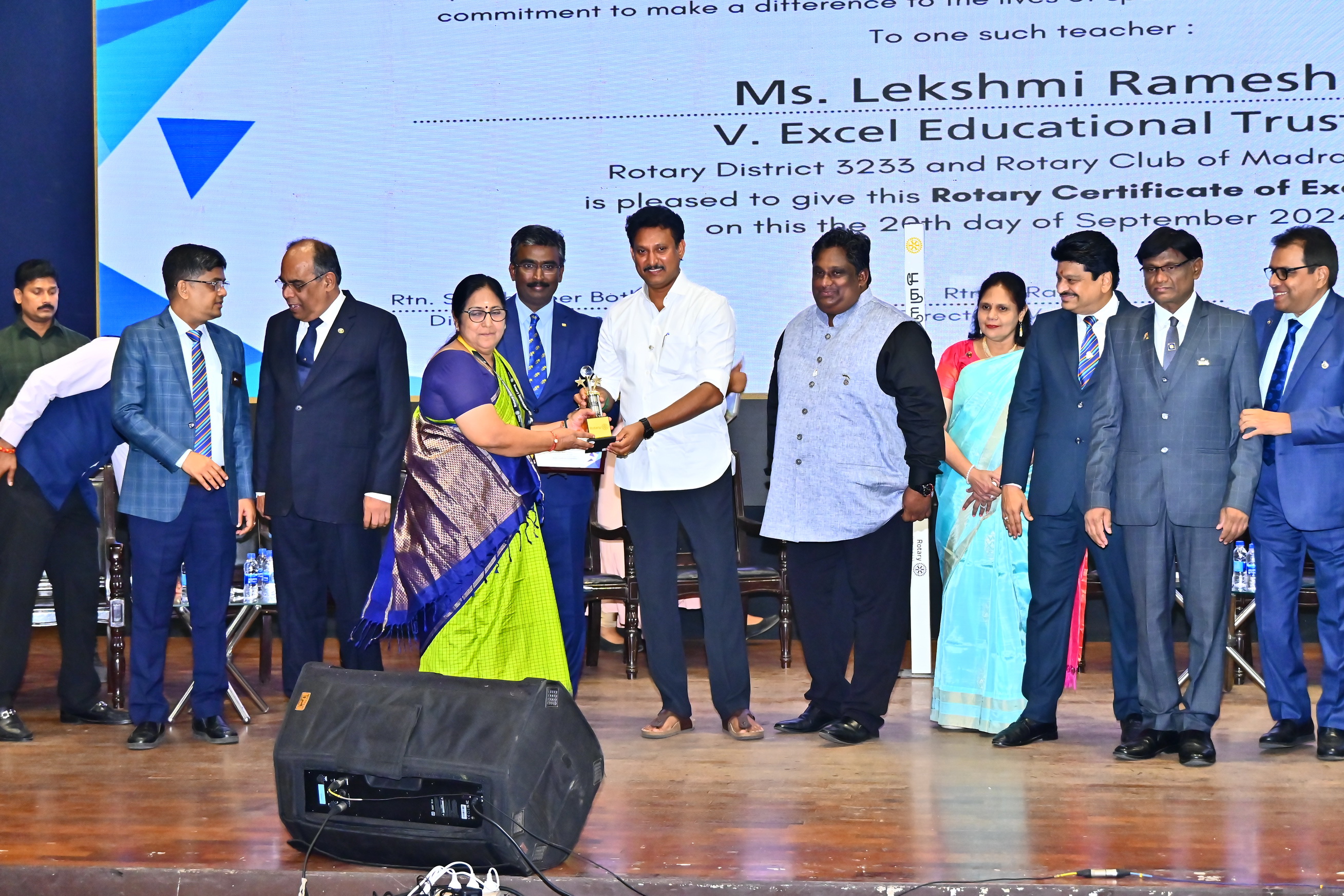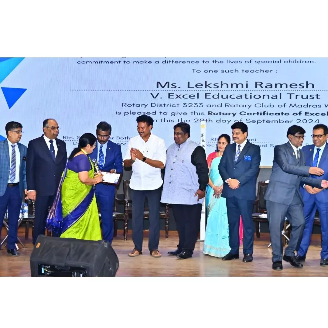 The Honourable Minister for School Education in Tamil Nadu, Thiru Anbil Mahesh Poyyamozhi graced the ceremony. Lekshmi says, "It was indeed a proud moment to get this award and I am grateful to Rotary International for this. I consider this as an appreciation of the work that we are all involved in, me representing V - Excel. I believe that the children whose lives we have touched, the support of the donors and my team has resulted in this."