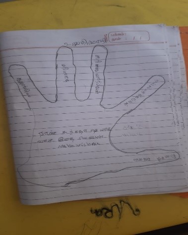 students were given five tips to practice everyday. They drew their palm and wrote each tip in a finger. The students were divided into 5 group. Each group spoke about the value/tip that they had to follow everyday.
