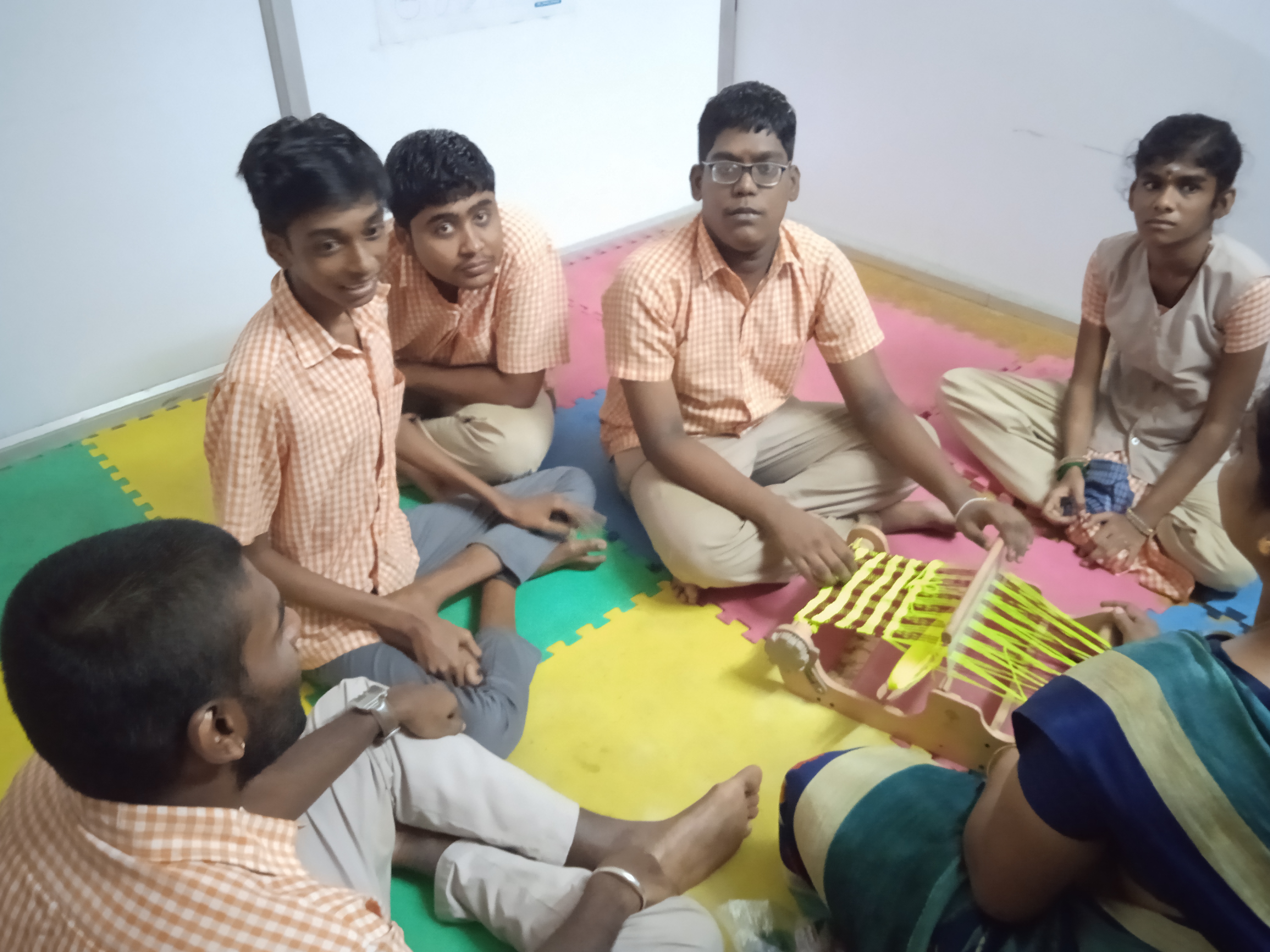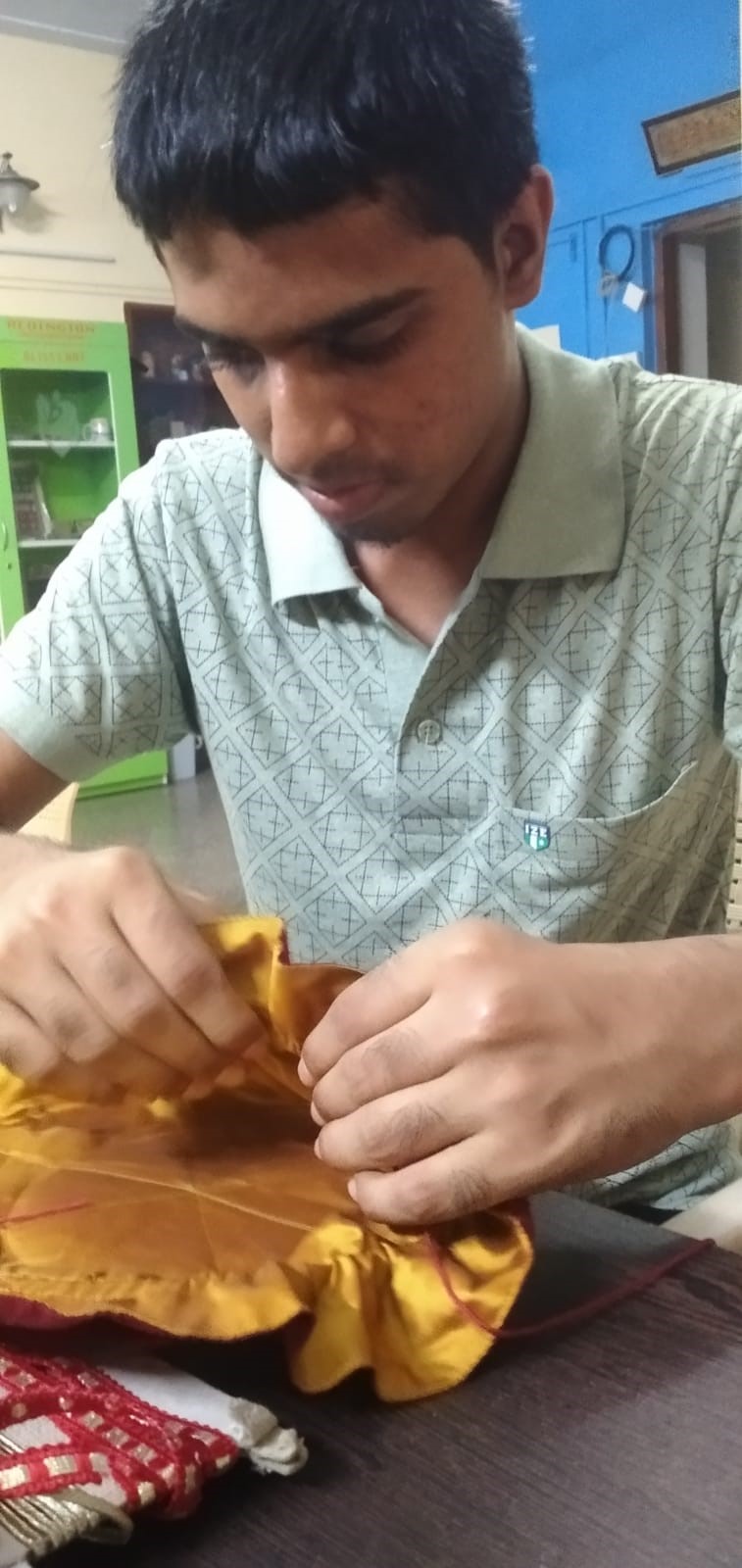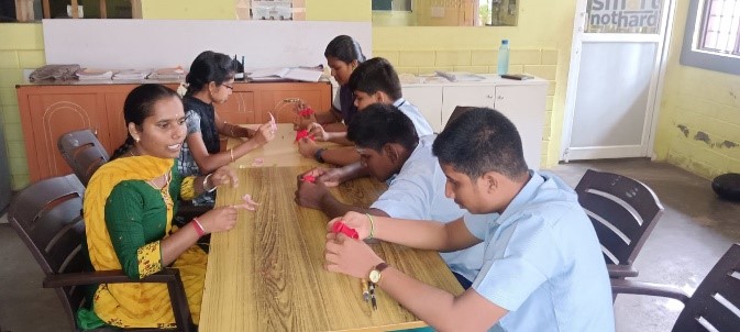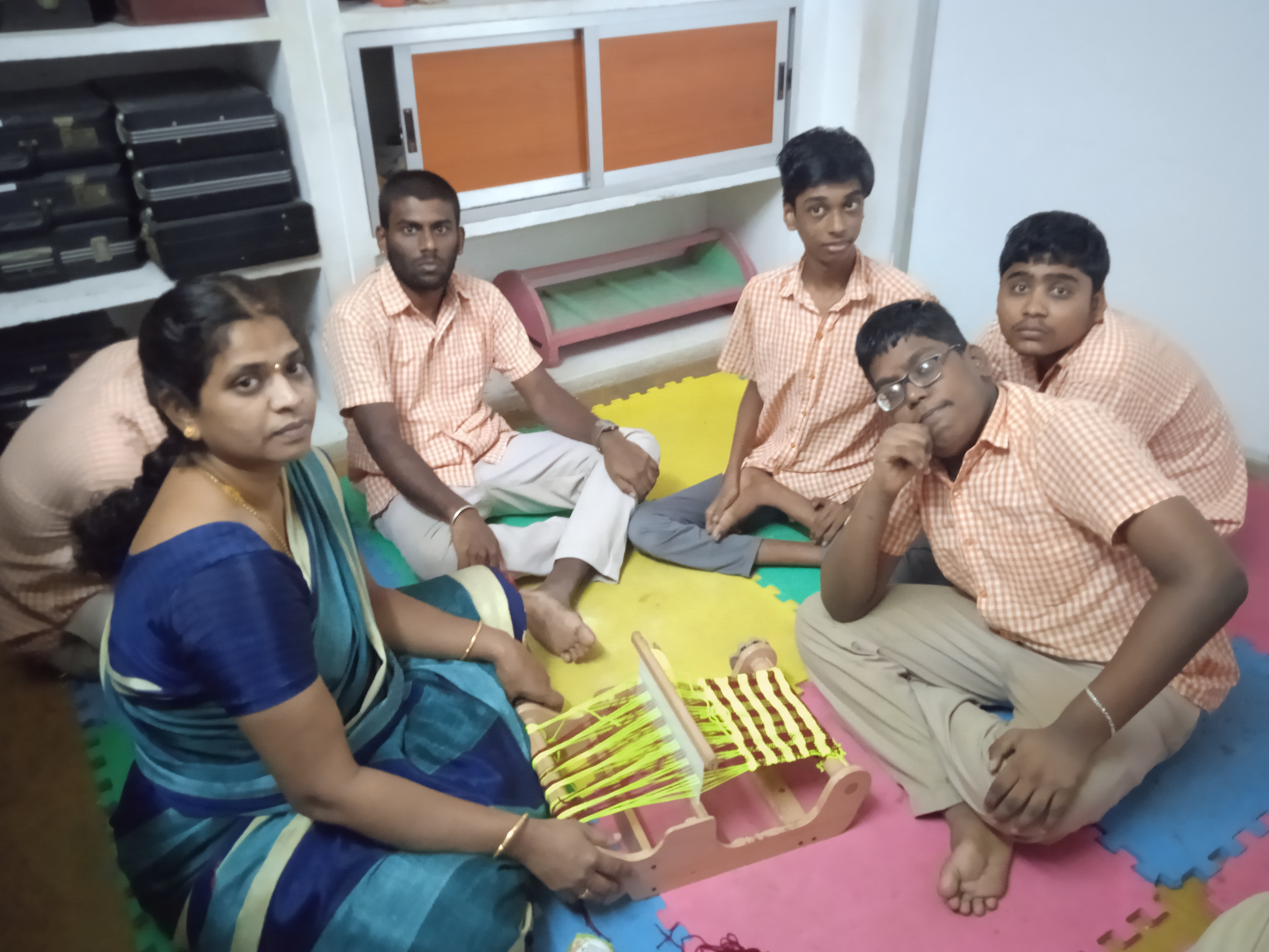 Our Pre vocational students have started making paper bags and weaving woolen mats. They learned eagerly, the process of making it. The students could fold and paste paper by themselves under the supervision of our technical staff. Pre vocational students watched and observed the process of weaving mats and now they can handle the weaving machine safely under our supervision.