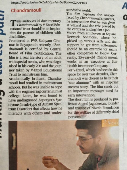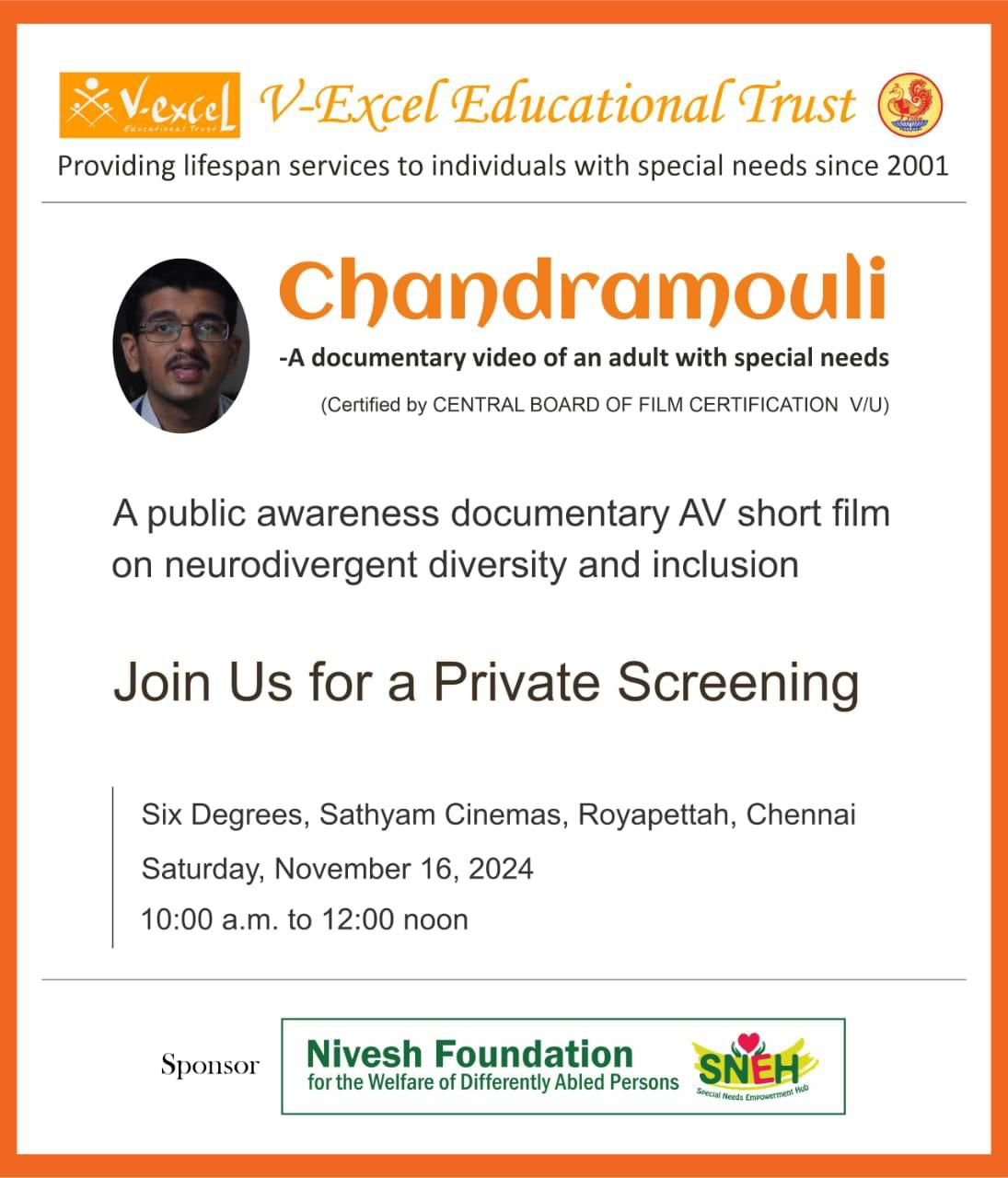 V-Excel proudly presented a documentary AV short film (certified by CBFC) titled Chandramouli: A Real-life Story of an Adult with Special Needs premiered at PVR Sathyam Cinemas, Royapettah, Chennai on 16th November 2024.