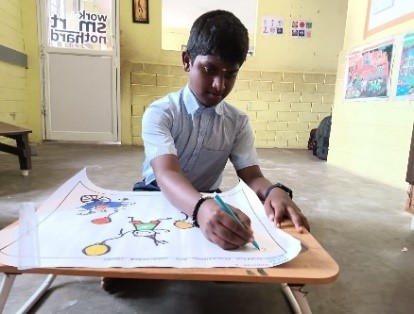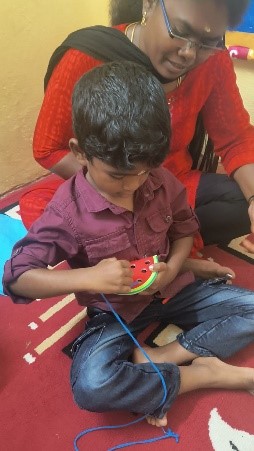Dikshit able to connect with people easily with social smile He was adamant and hyperactive and now his behaviour slowly started shifting, as he began getting used to this new environment, and his guide, Saranya ma'am. Engaging in activities alongside her has helped in regulating his behavioural concerns. There has been significant improvements in his sitting and waiting tolerances. He is also able to complete given tasks now, which was something that was difficult for him to do earlier.