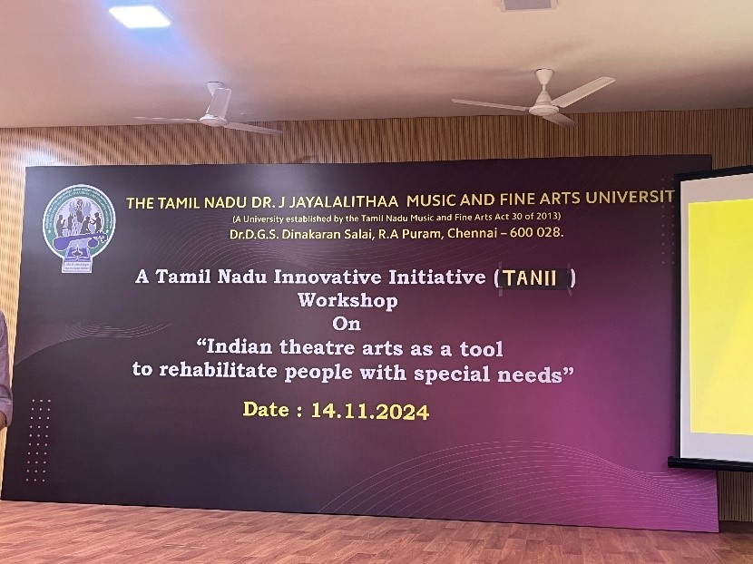 Charu and Uma attended workshop on ITAID – Indian Theatre Arts for Integrated Development a project intended for the rehabilitation of the children and adults with special needs. This was organised by The Tamil Nadu R. J. Jayalalitha's Music and Fine Arts University. The workshop was an introduction on the 6 months intensive certificate training on using various art forms like Music, Dance, Theare, Art, Puppetry and Storytelling to rehabilitate people with special needs. All experts from each art presented how they were able to rehabilitate and with this course how many organisations and parents can apply. It was wonderful workshop and with basic introduction and information, we could learn many things that could be useful for our community.