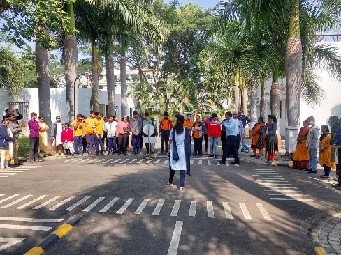 Videos and real-life demonstrations further reinforced the importance of zebra crossings, footpaths, and subways. The session concluded with a distribution of biscuits and group pictures, making it both an educational and enjoyable experience.