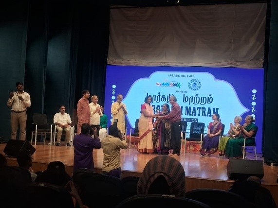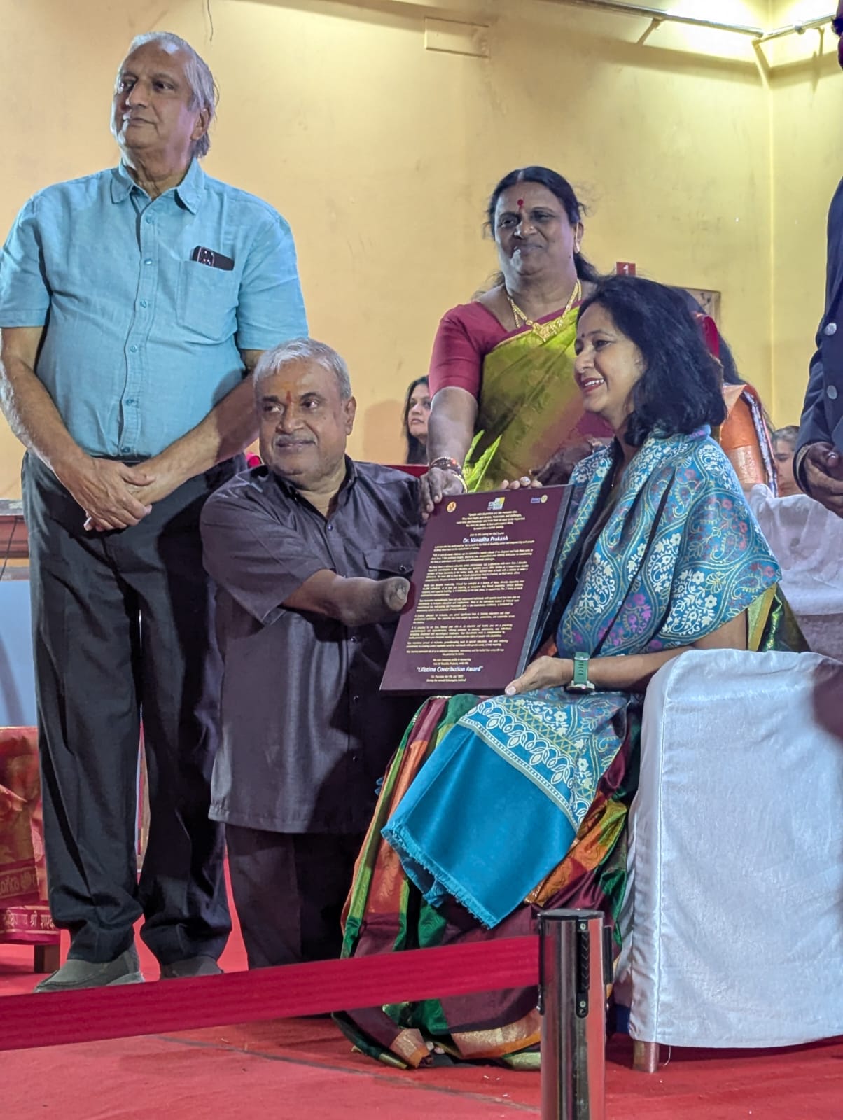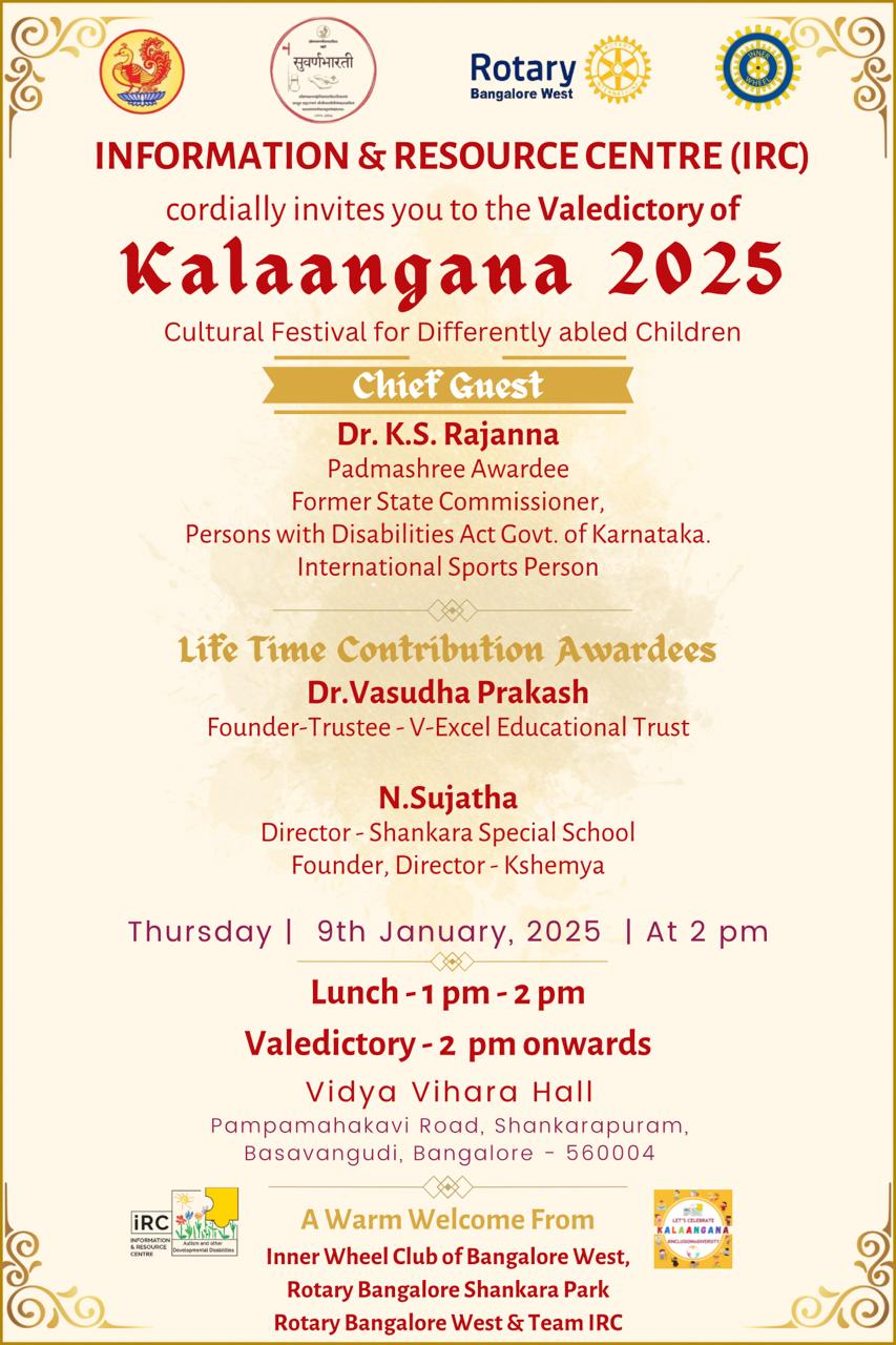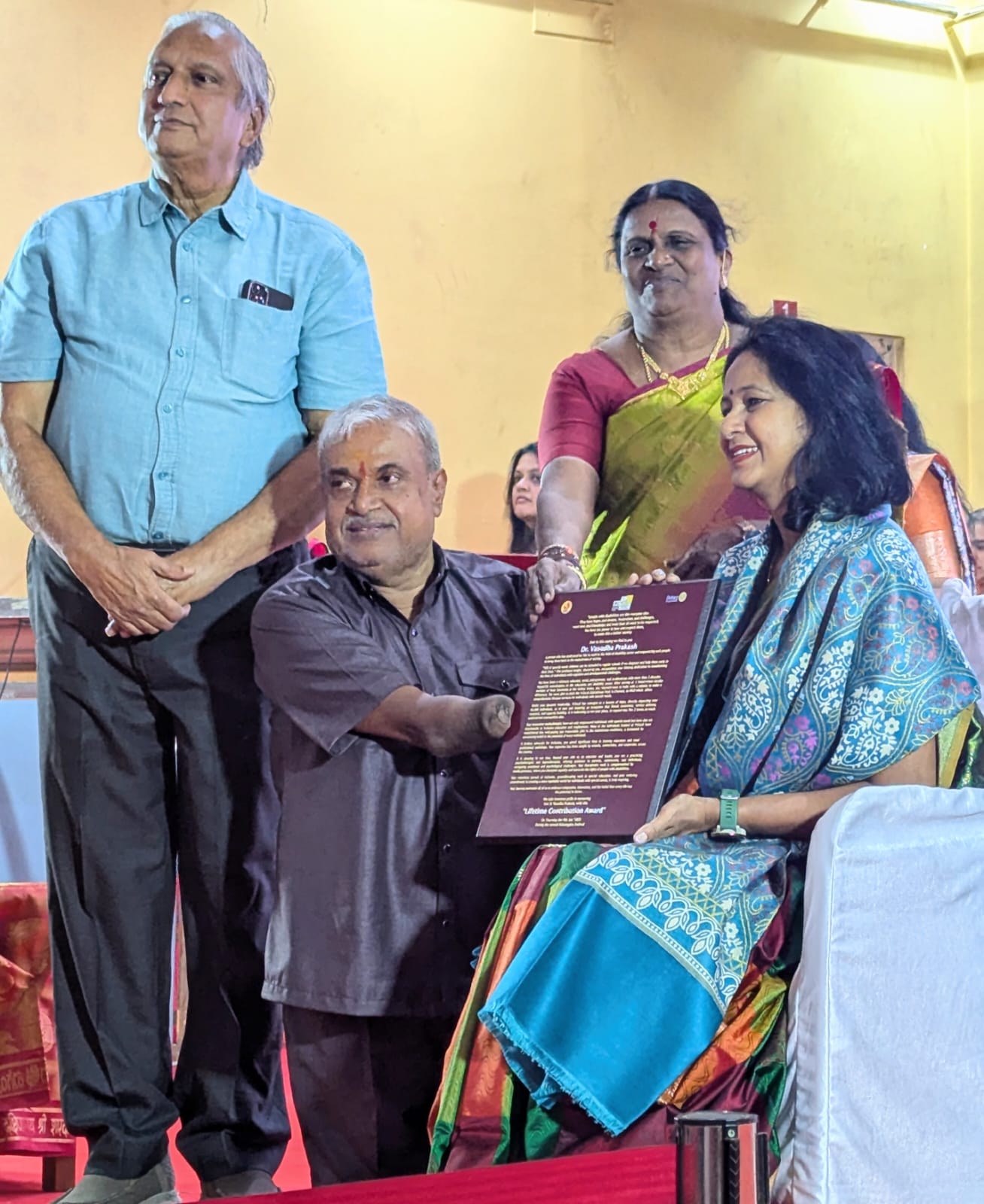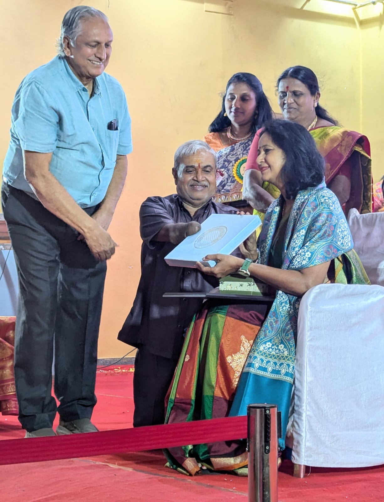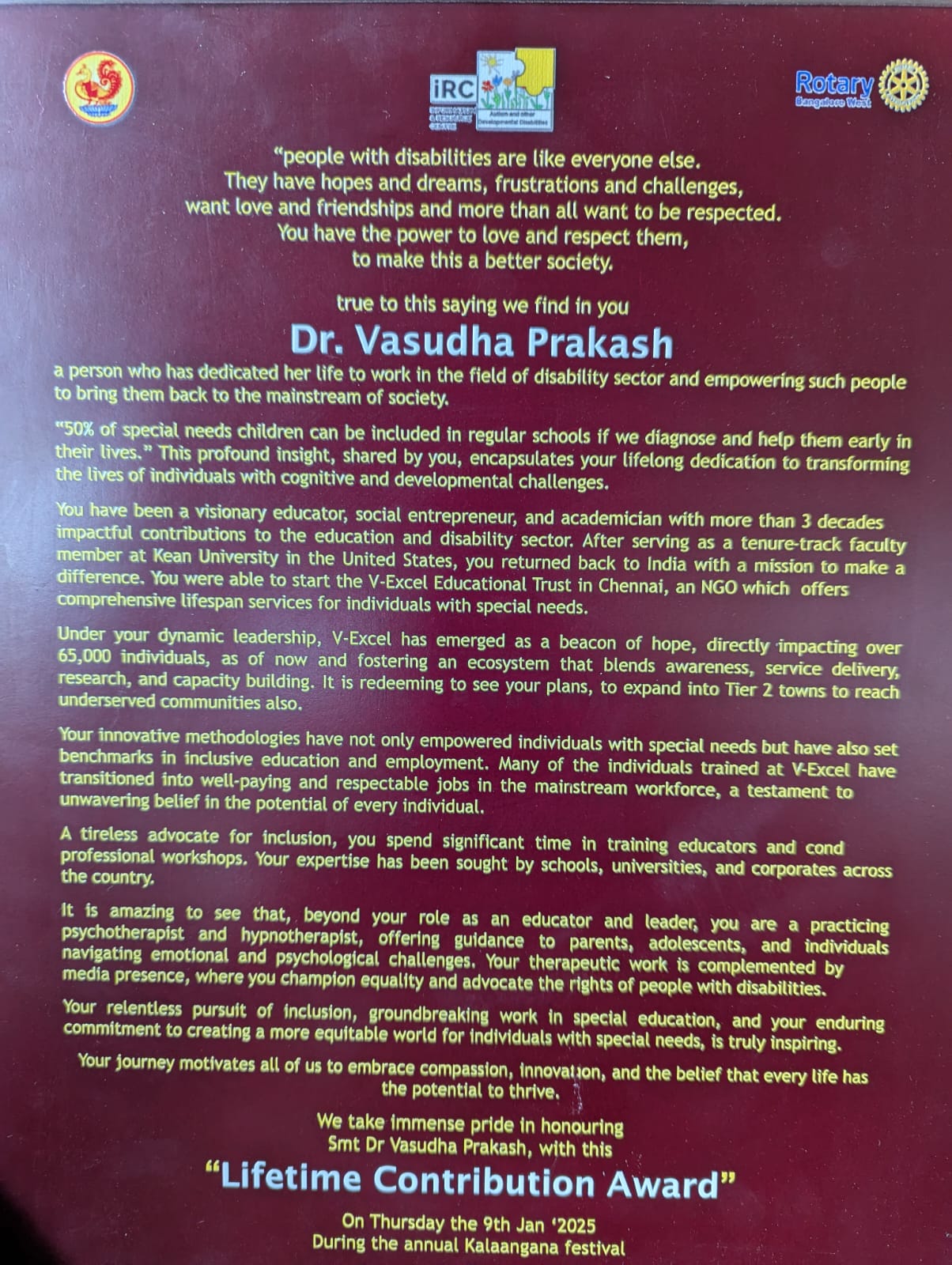 The Information and Resource Centre (IRC), a unit of Sri Sharada Peetham, Sringeri, in association with Rotary Bangalore (West) organized and conducted Kalaangana 2025, a cultural festival of art, yoga, dance and music for differently-abled children. As part of the festivities held on Thursday, January 9, the organization presented a Lifetime Contribution Award to Dr. Vasudha Prakash, our Founder-Director. The function was held at the Vidya Vihara Hall in Basavanagudi, Bangalore.