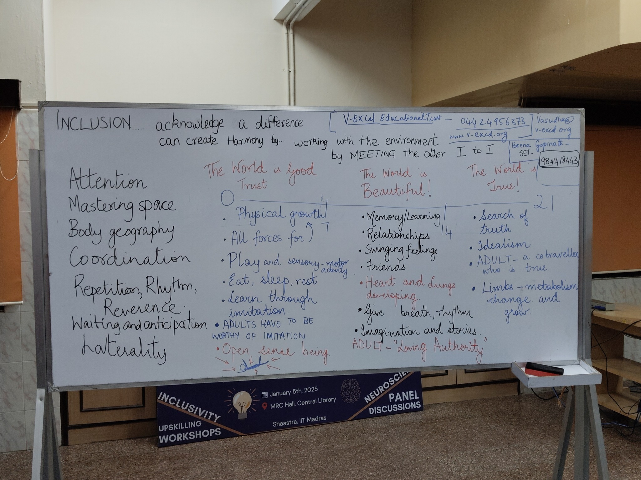 At the 2-day conference held on 4th and 5th January, 2025 at IIT Madras, our team of special educators led by Gita Bhalla (Associate Director), Neha Bharadwaj and Puja Bhalla, conducted a 3-hour participatory workshop on "Inclusion in the Early Years". This was a part of a series of upskilling workshops and seminars held by experts from the Indian Association for Child and Adolescent Mental Health (IACAM) and the education industry to impart knowledge about researched alternative methods of teaching, inclusivity in classrooms, and related themes.