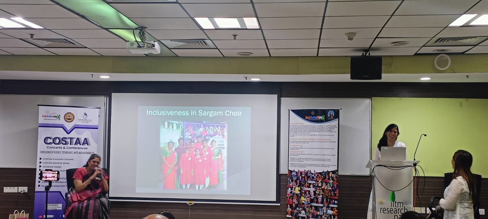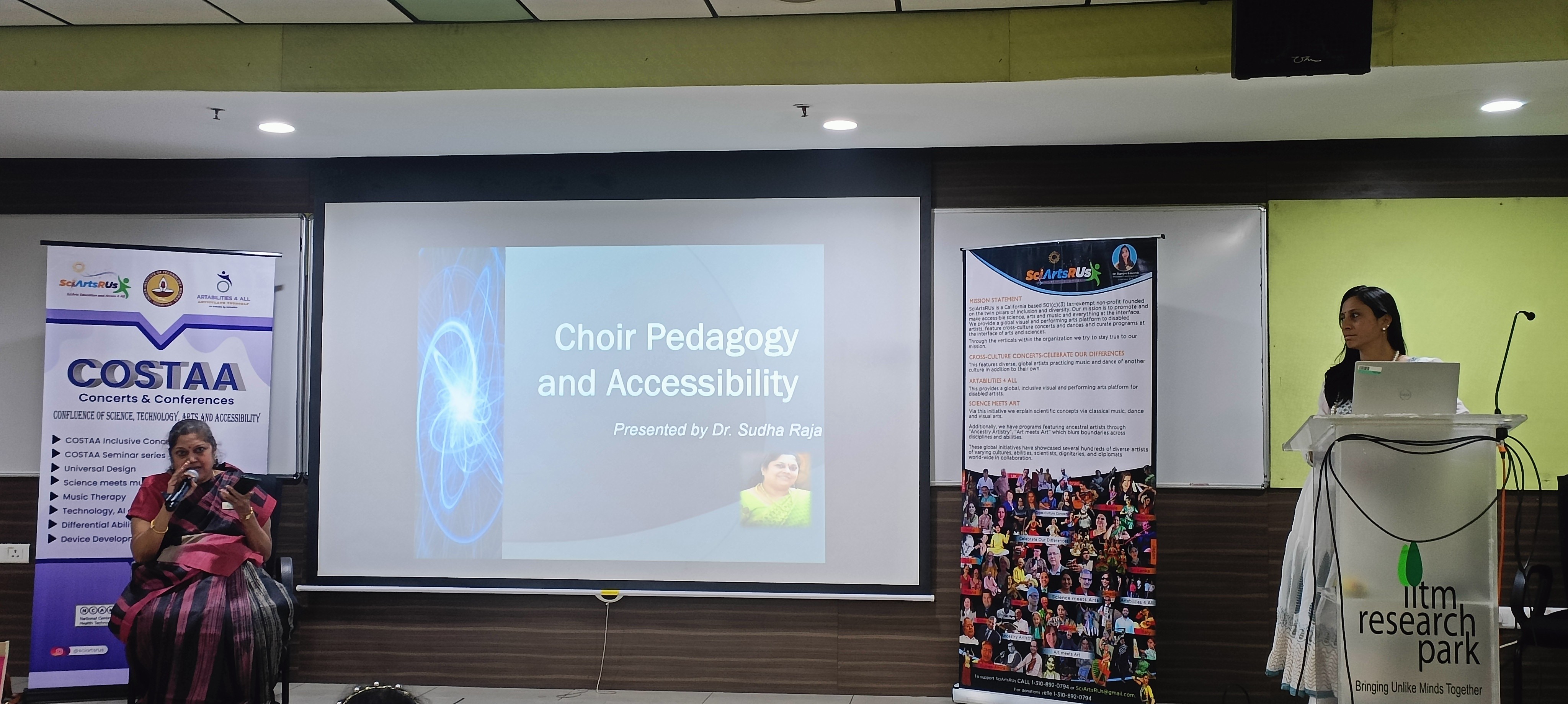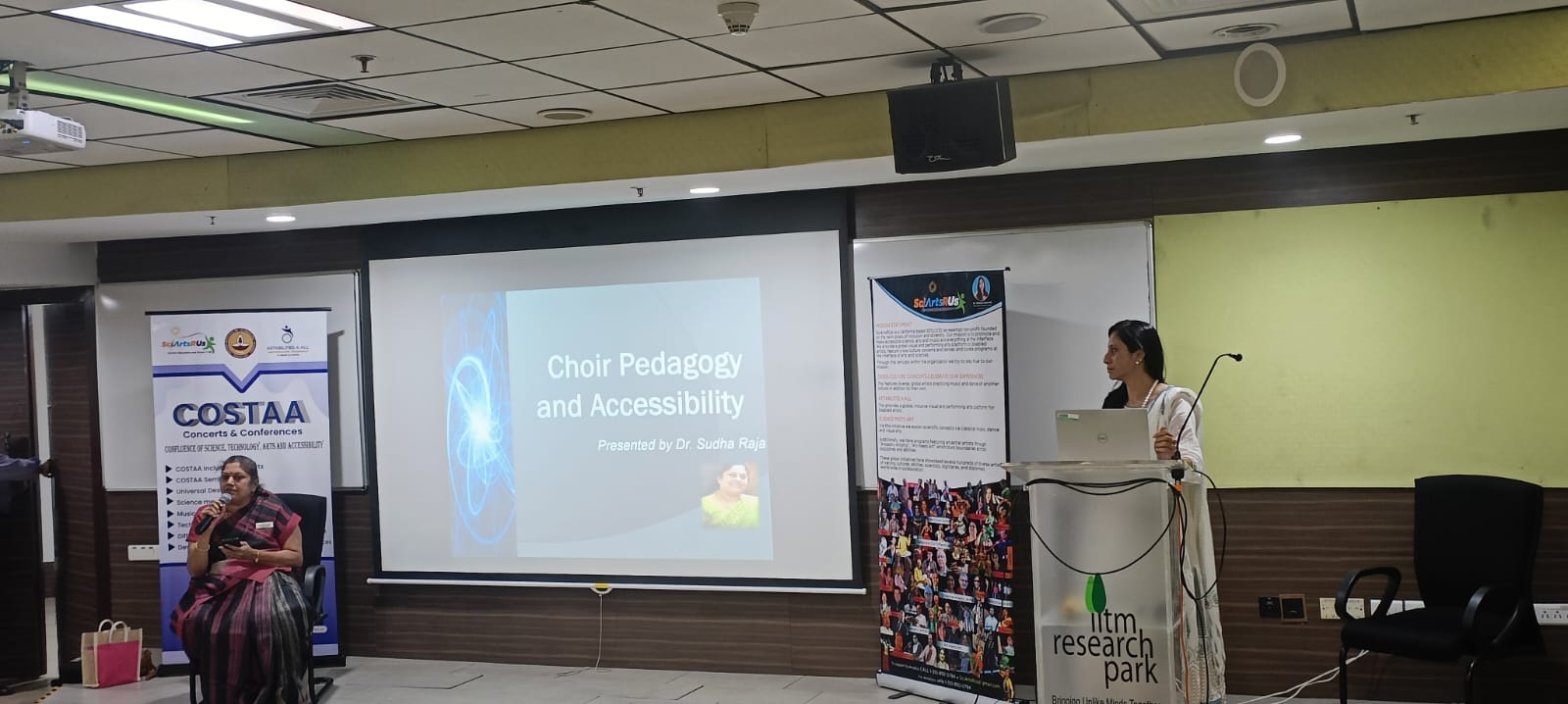 Dr. Sudha Raja of Sargam Choir gave an inspiring lecture-demonstration on "Choir Pedagogy and Accessibility" at COSTAA Conference 2025 at IIT Madras Research Park, Chennai. She spoke about the therapeutic aspects of music and her involvement in training individuals with special needs. Ms. Gayathri Suryanarayanan of V-Excel also shared the inspiring journey of trainees in the inclusive choir.