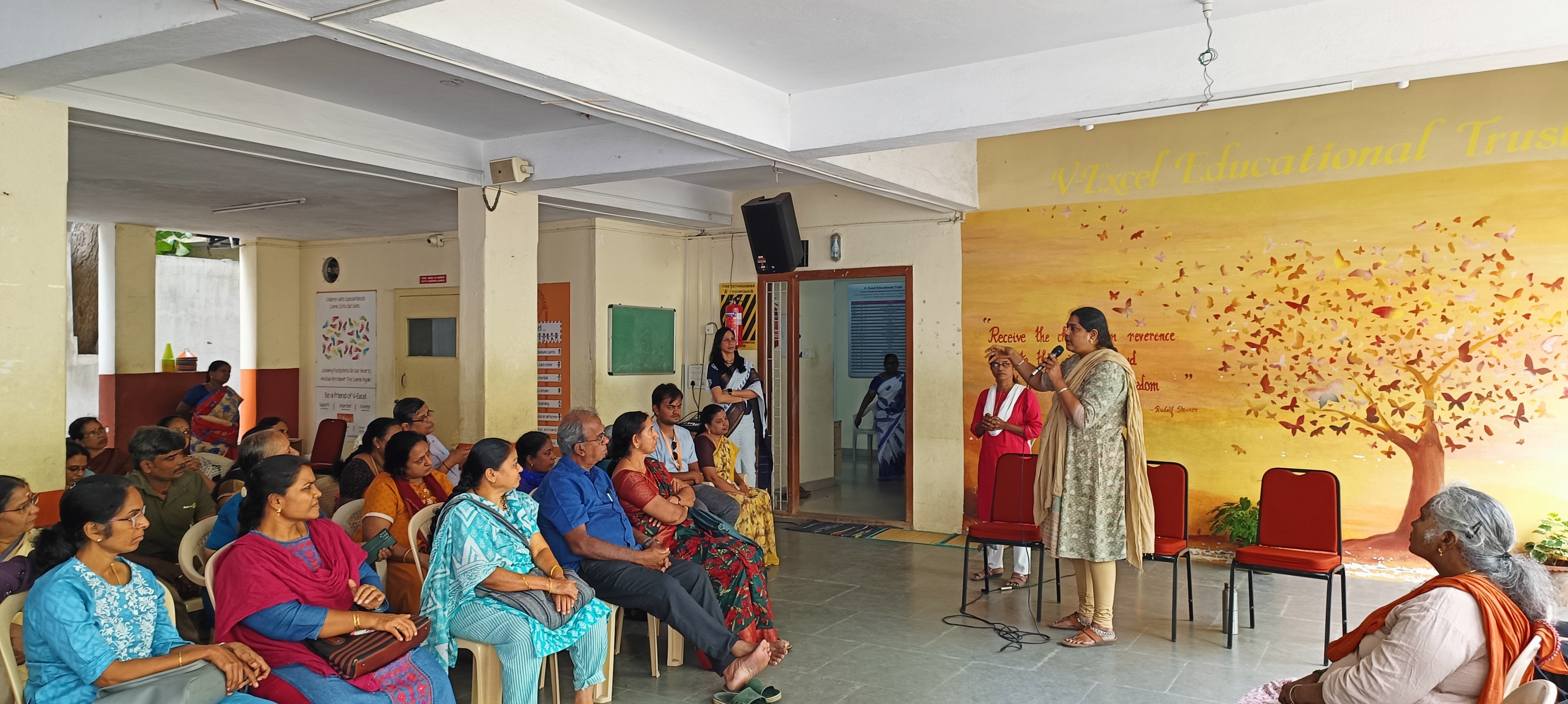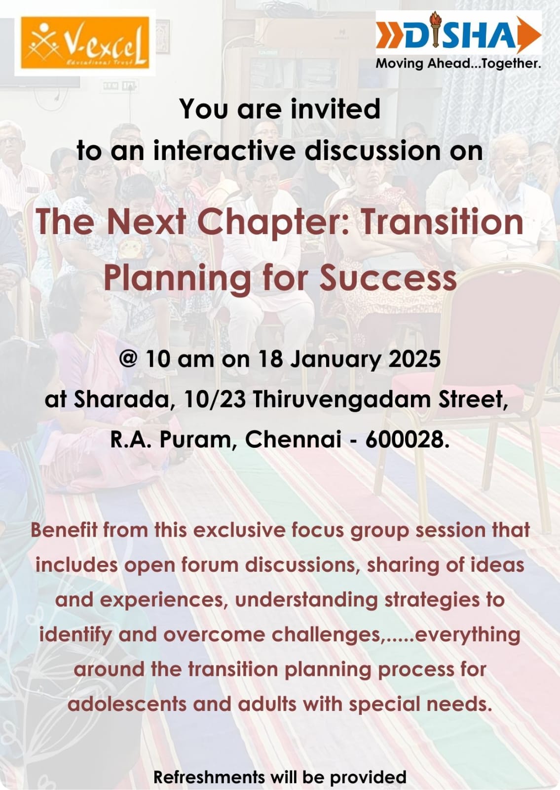 On January 18, 2025, we held an enriching Disha meeting at Sharada, V-Excel's Head Office in R.A. Puram, Chennai. With the theme "The Next Chapter – Transition Planning for Success," this forum brought together 70 participants, including parents and members of the V-Excel team. The insightful session was led by Ms. Gayathri Suryanarayanan, Center Coordinator of V-Excel's Mylapore center.