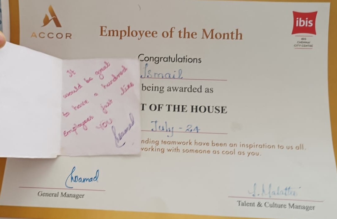 A particularly poignant moment of the meeting was when Mr. Mohammed Bilai shared his son Ismail's progress. Ismail was a trainee in our YES unit in Mylapore Chennai and has been working in the F&B section of the Ibis Hotel, City Centre. Ismail was recognized as the Employee of the Month last year and we are proud to share his merit certificate.
