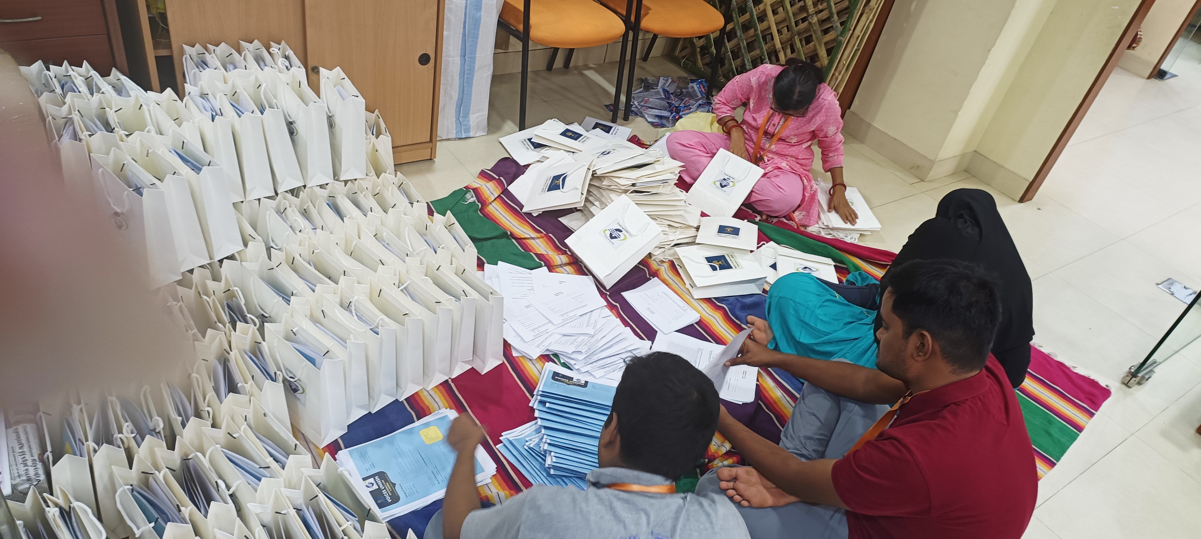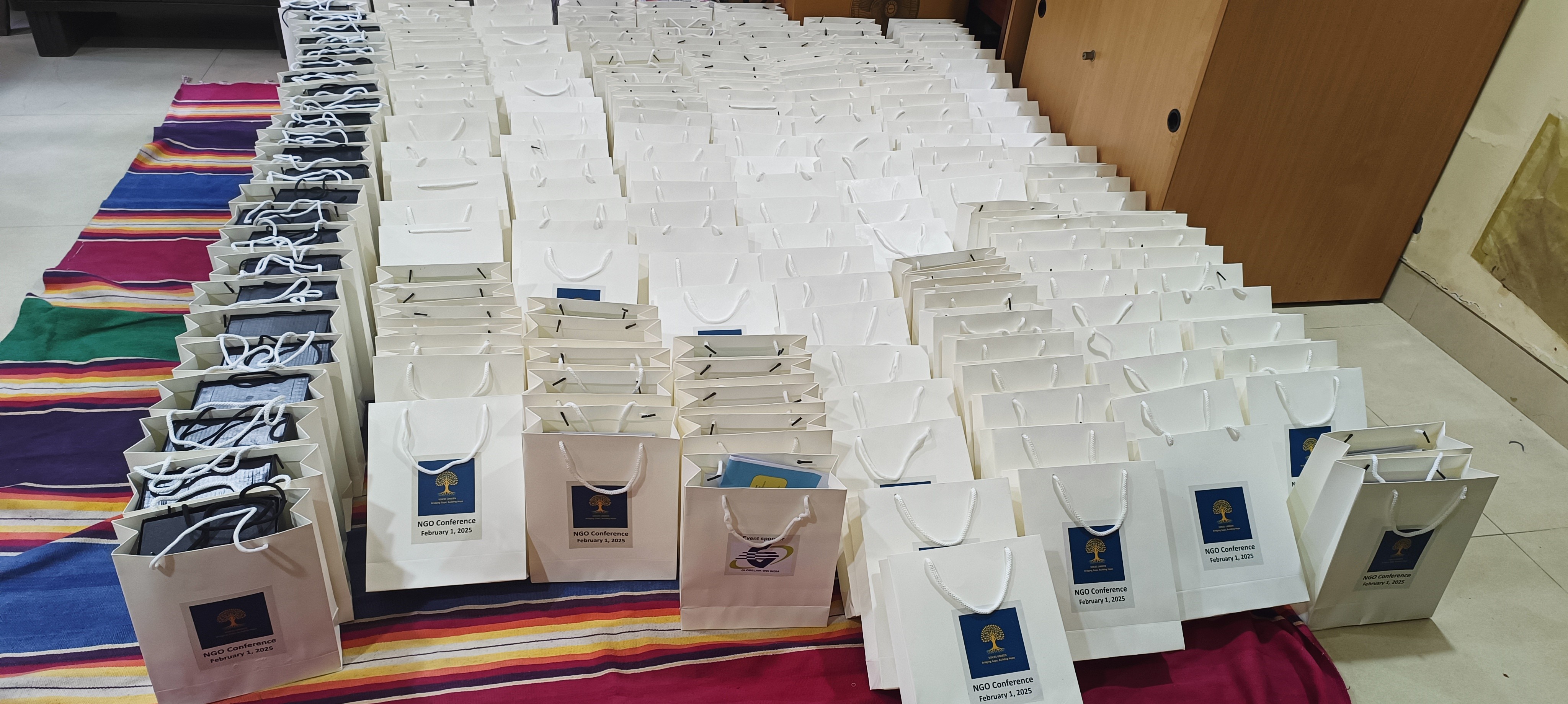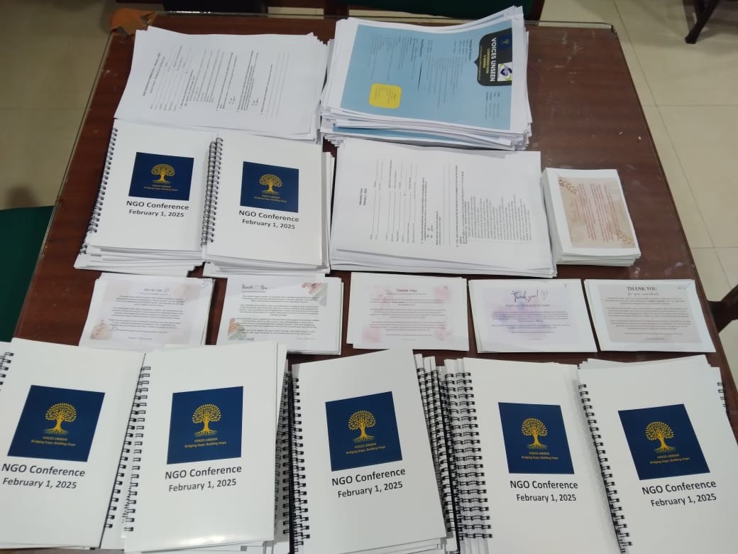 YES, team came together to get things for the NGO conference, Voices Unseen. The conference was planned for 01 February 2025. About 175 registration kits, 25 gift hampers, and 175 conference badges were designed and made in YES. Each registration kit included a Wiro bound notebook, thank you card, feedback form, federation form, a pen and the agenda. All these items were packed and delivered at the venue on time.