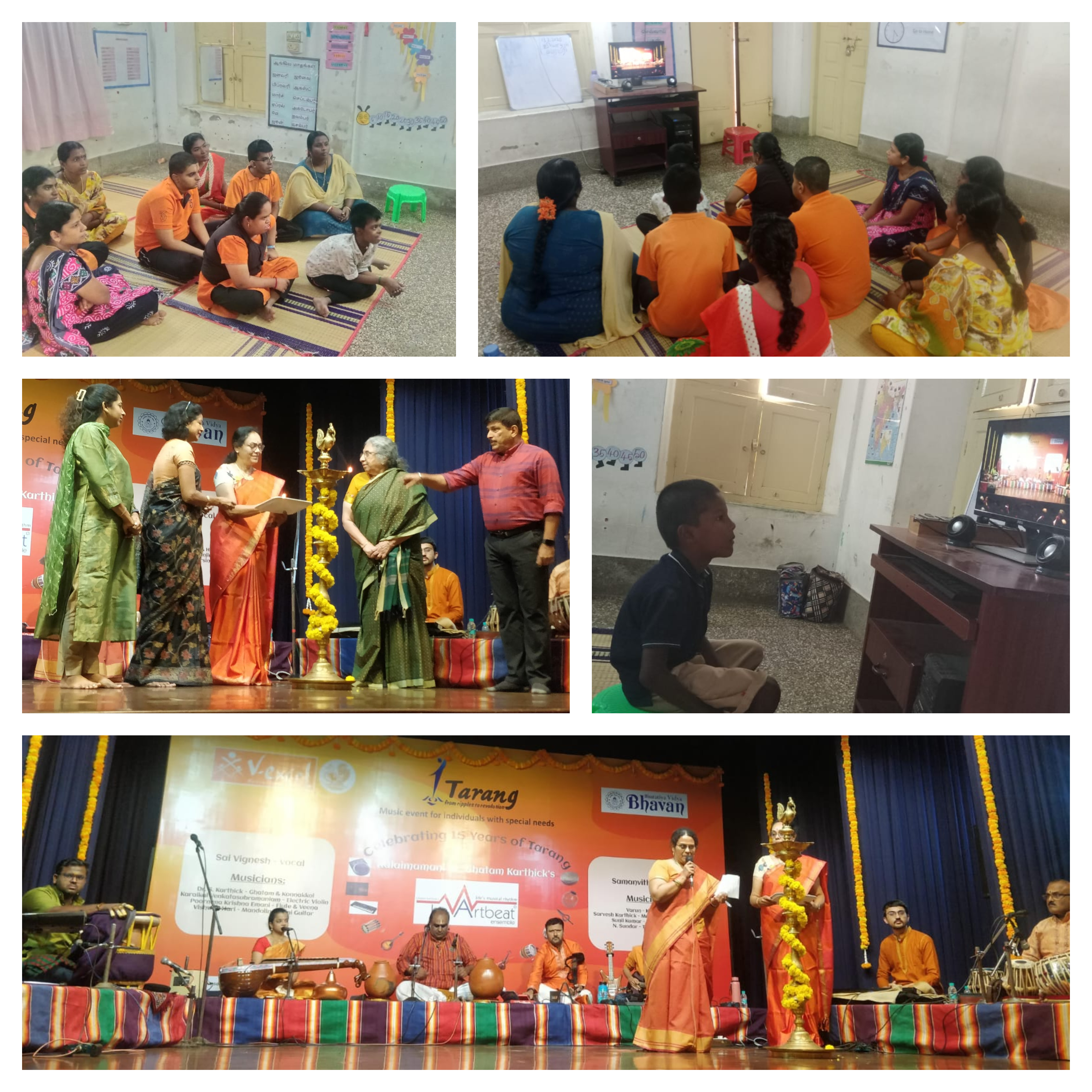 Tarang, the music / dance program for the special students and trainees, celebrated its 15th year in a grand way on February 13th Thursday between 2.00 to 4.00 pm at Bharatiya Vidya Bhavan. The Art beat Ensemble of Kalaimamani Dr. Ghatam Karthick with his team of percussionists and musicians entertained the captive audience of our students with rhythm and beats with their mesmerising music and songs by Sai Vignesh and Samanvitha.
