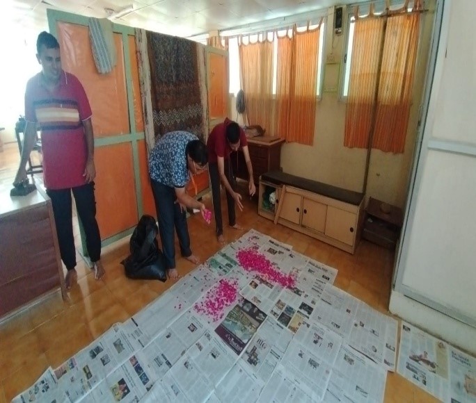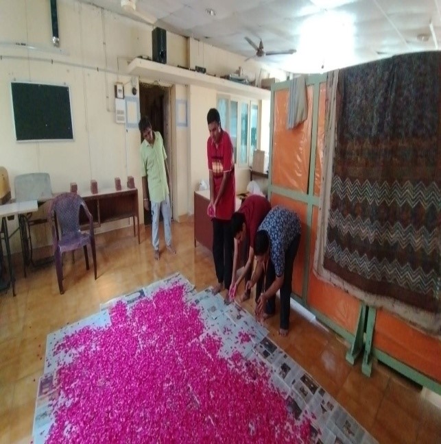 Craftizan activity of making eco friendly Color powders for the festival of HOLI was taken up. The trainees depetalled some flowers. They learnt to dry these petals in the shade carefully each day and store it safely at the end of the day. Many a gait and hand function improved with this activity.