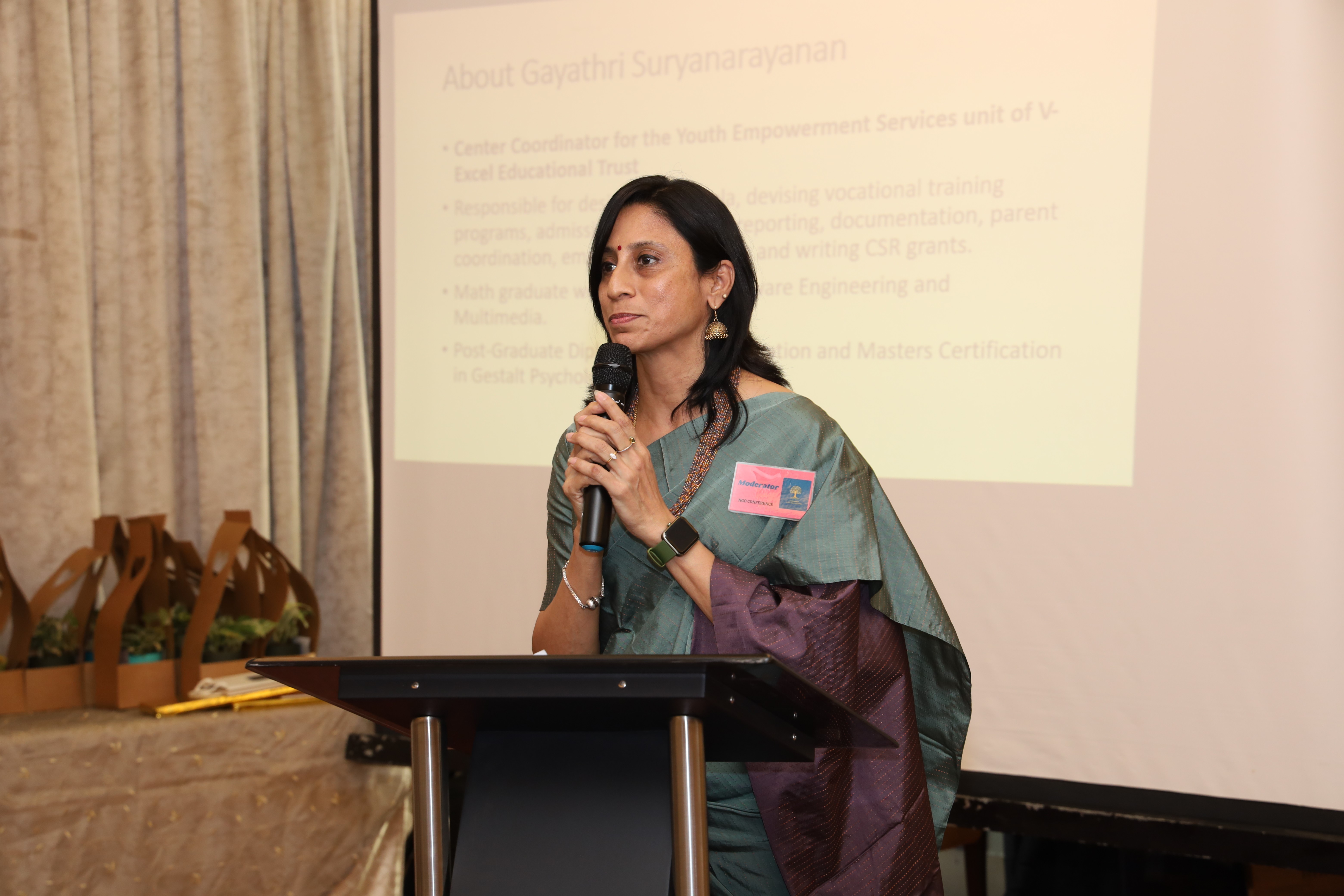 V-Excel was invited to have a product stall at the event, and products from the two vocational units, Youth Empowerment Services (YES) and Vocational Training Unit (VTU) were on display and for sale. Ms. Gayathri Suryanarayanan, Centre Coordinator, YES was invited to be one of 4 panelists on a topic entitled, "Sane Teens", which focused on adolescence. It highlighted the challenges faced by young adults and their parents while navigating adolescence. Gayathri spoke regarding adolescents with special needs.