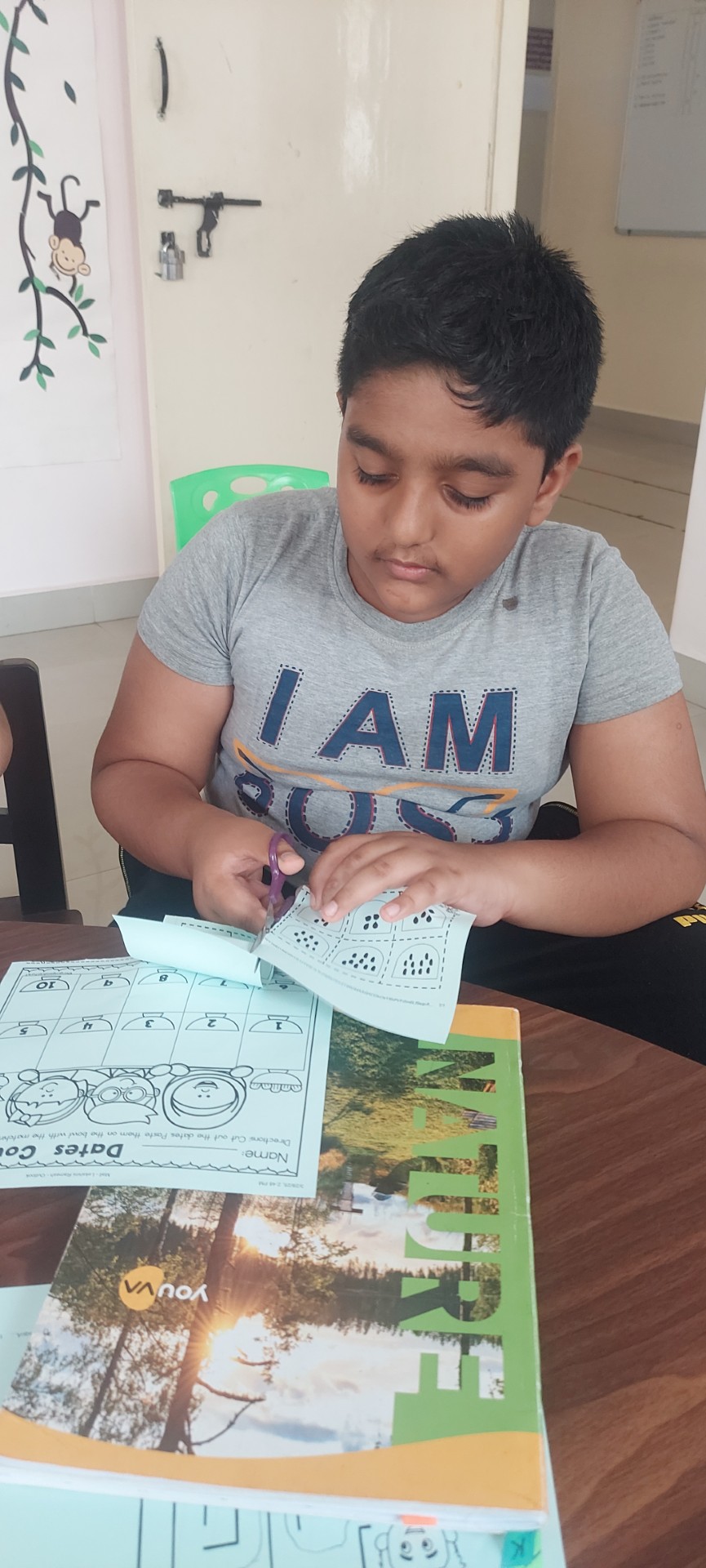 He started the individual sessions in 2022. During the initial days, he was very shy and not interested in participating in the activities. His goal was to name pictures, improve his clarity of speech and pay attention during reading and writing tasks. With vocabulary and picture communication activities, Pavin was able to name pictures. He showed wonderful improvements in reading and writing words and clarity of speech. Towards the end of the year, he was able to complete his tasks with focus.