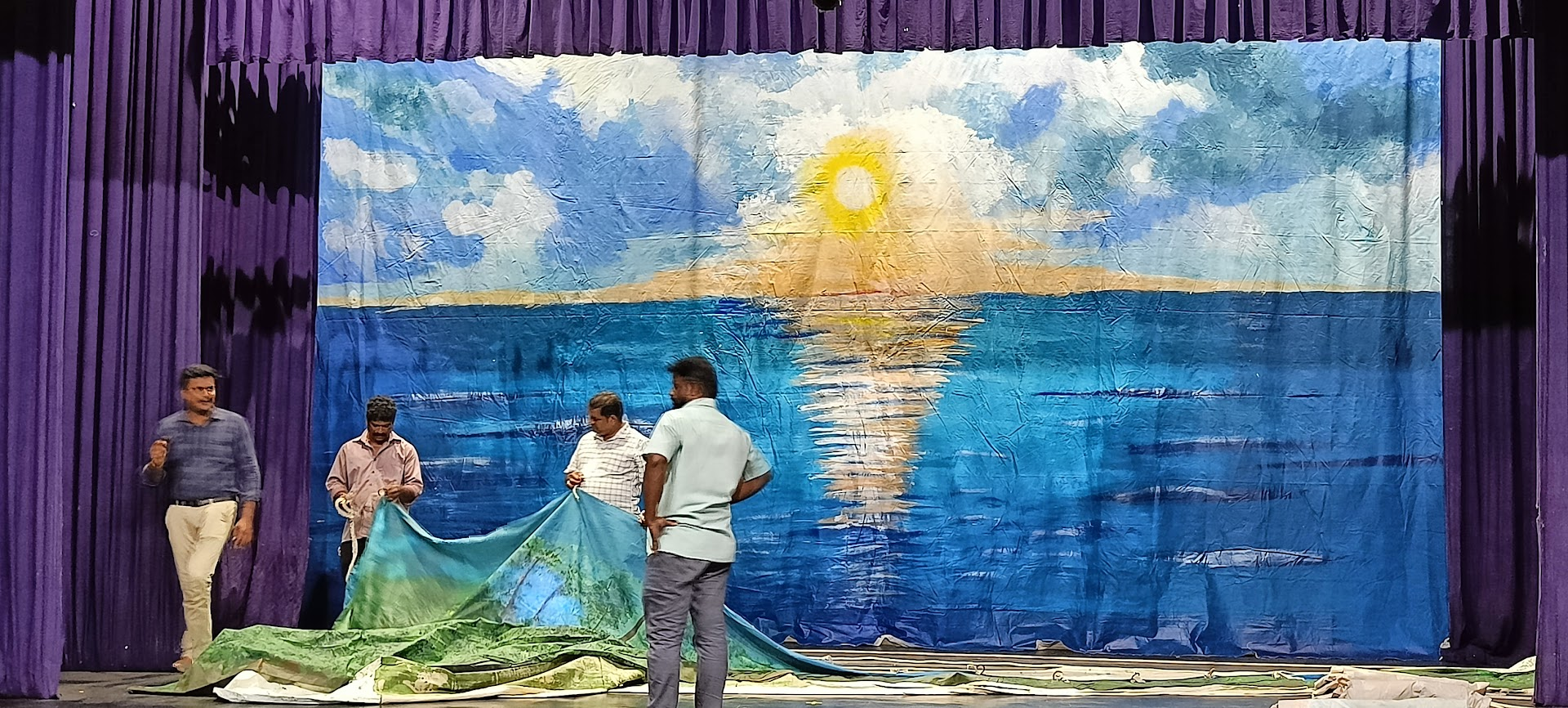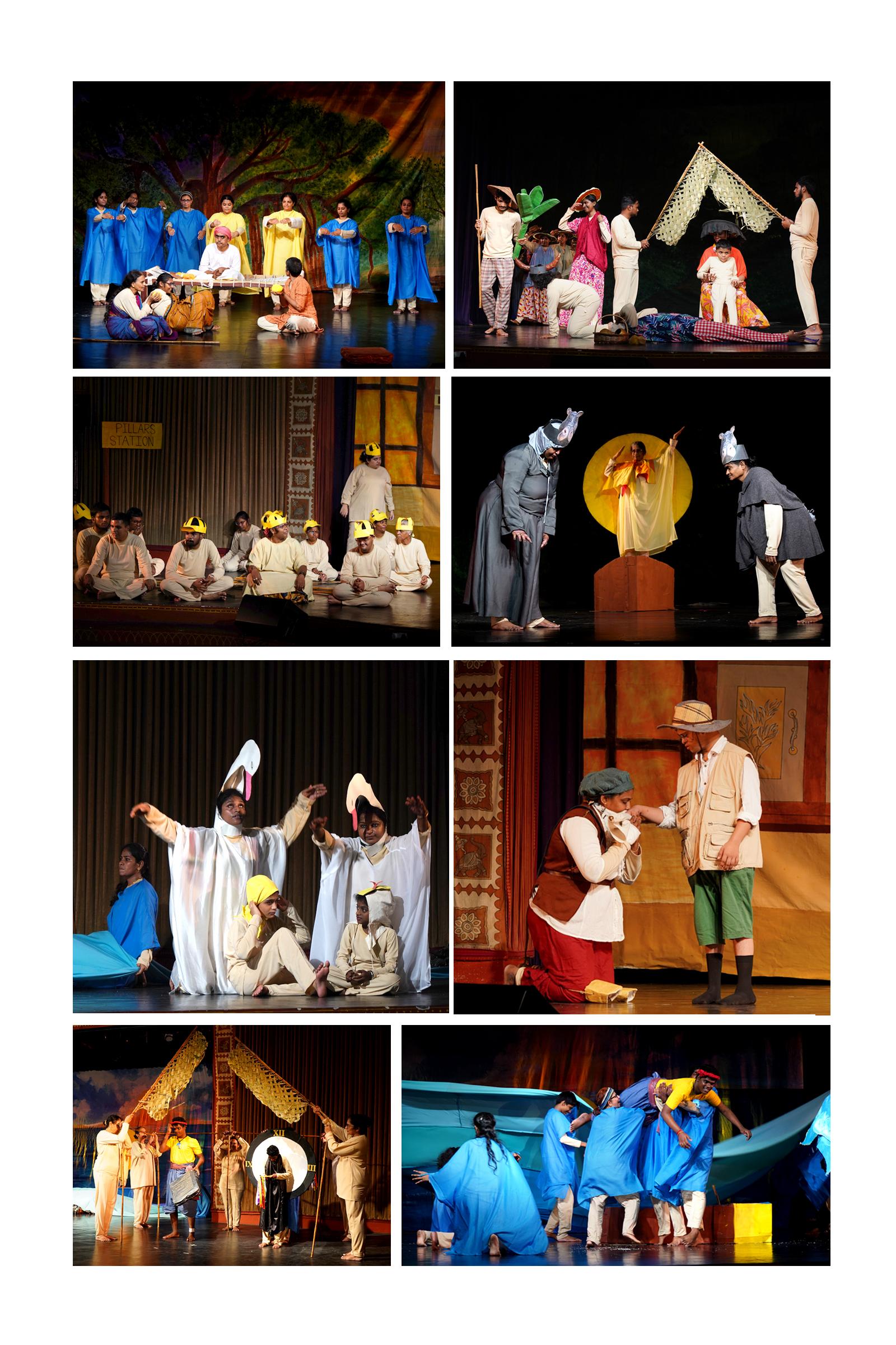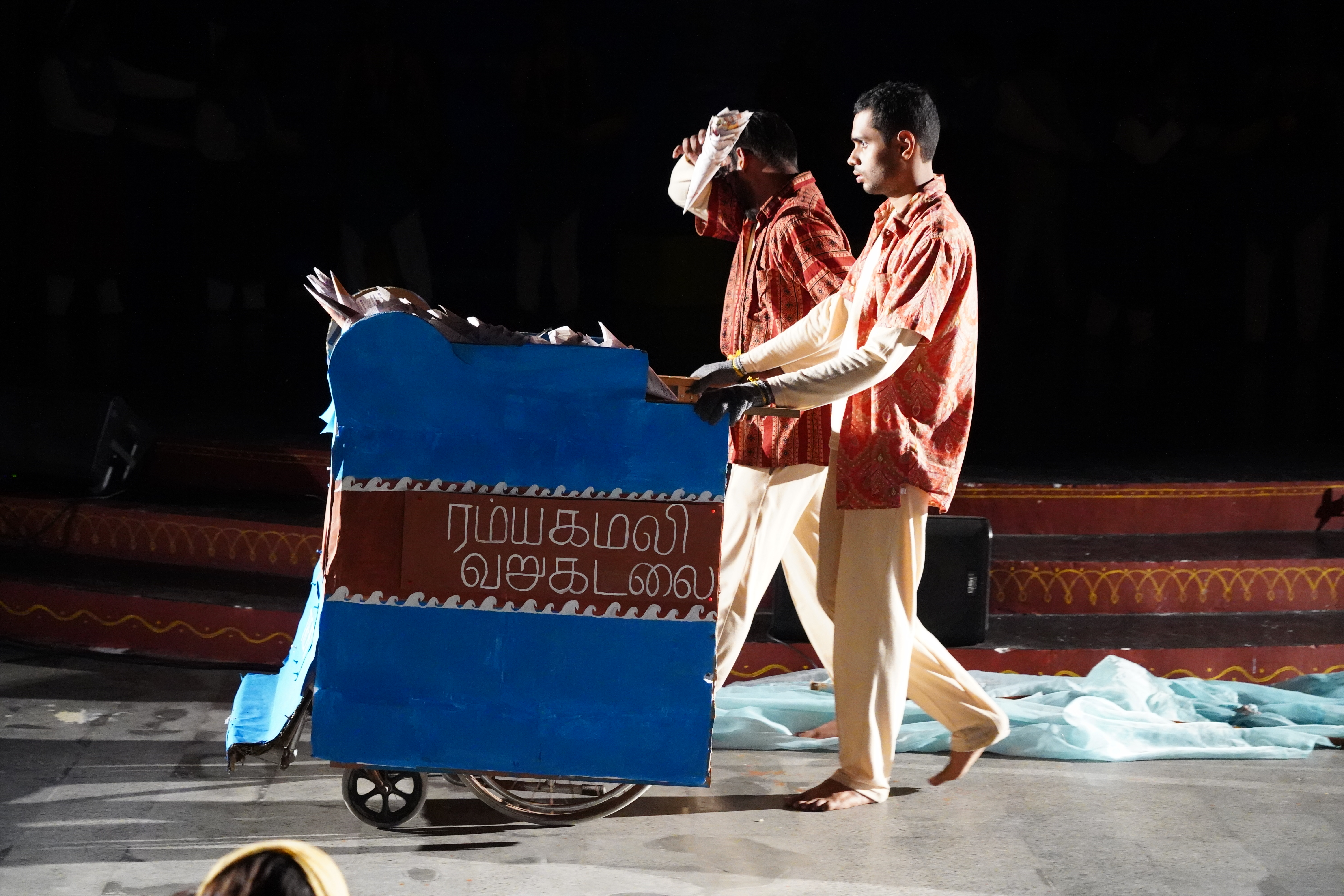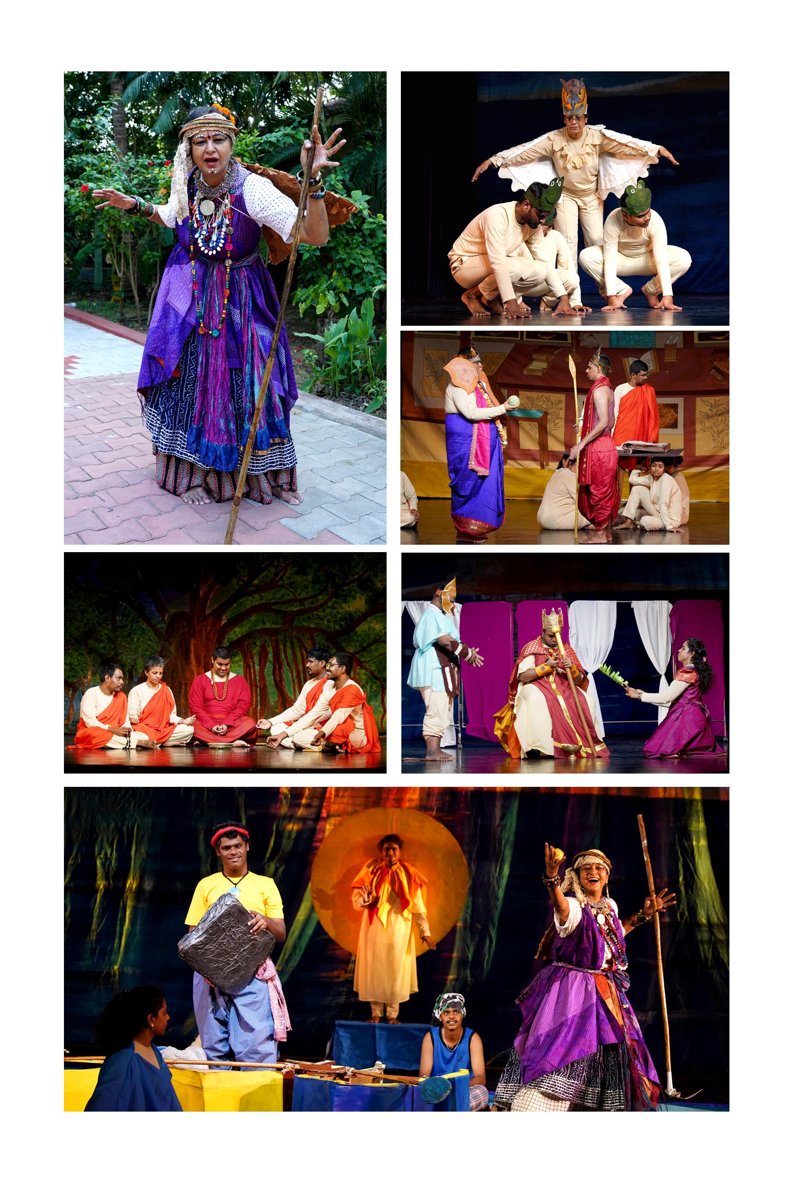 April arrived and the countdown had begun. A new venue, two practices, quick touching up and sometimes repairing of all the original props that were to be used, new props made, packing up of the costumes scene wise, packing up of the props, putting up the huge backdrops on the stage with the help of the Kalakshetra staff, moving the props and costumes to the venue carefully, arranging for the food, snacks for the next three days at the venue. This was the physical labour. Of course, on the soul front, there were emotional upheavals, some altercations which ended with a hug – it almost felt like we were organising a huge destination wedding. A drama that keeps the adrenaline flowing.