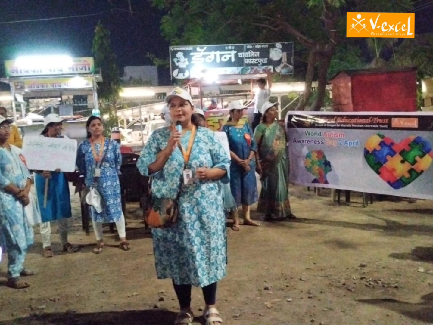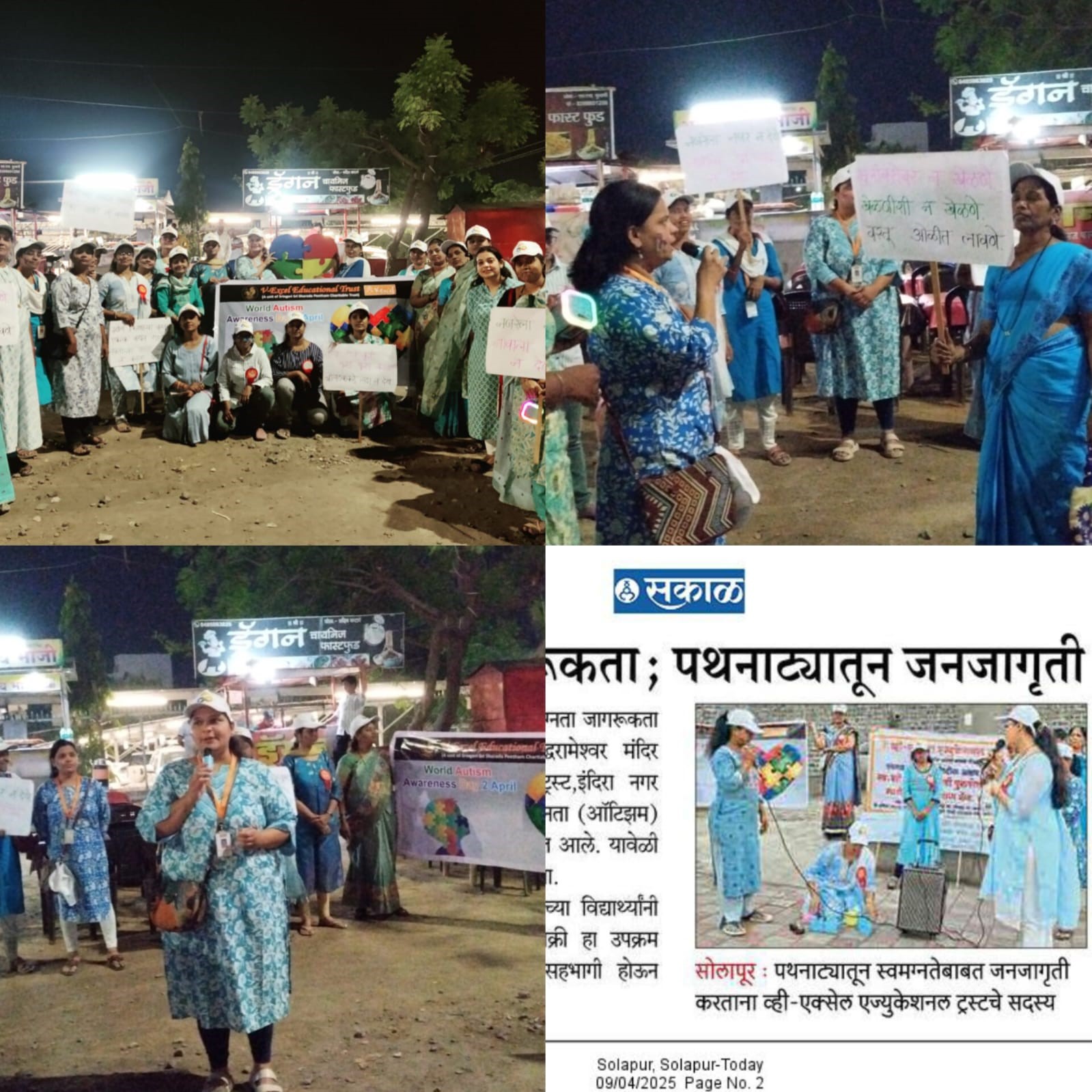 On World Autism Awareness Day (April 2nd), V-Excel Educational Trust, Solapur, took the initiative to spread awareness about autism through an impactful street play at one of the busiest locations in Jule Solapur – Rani Laxmibai Udyan, Dawat Chowk, near D-Mart.