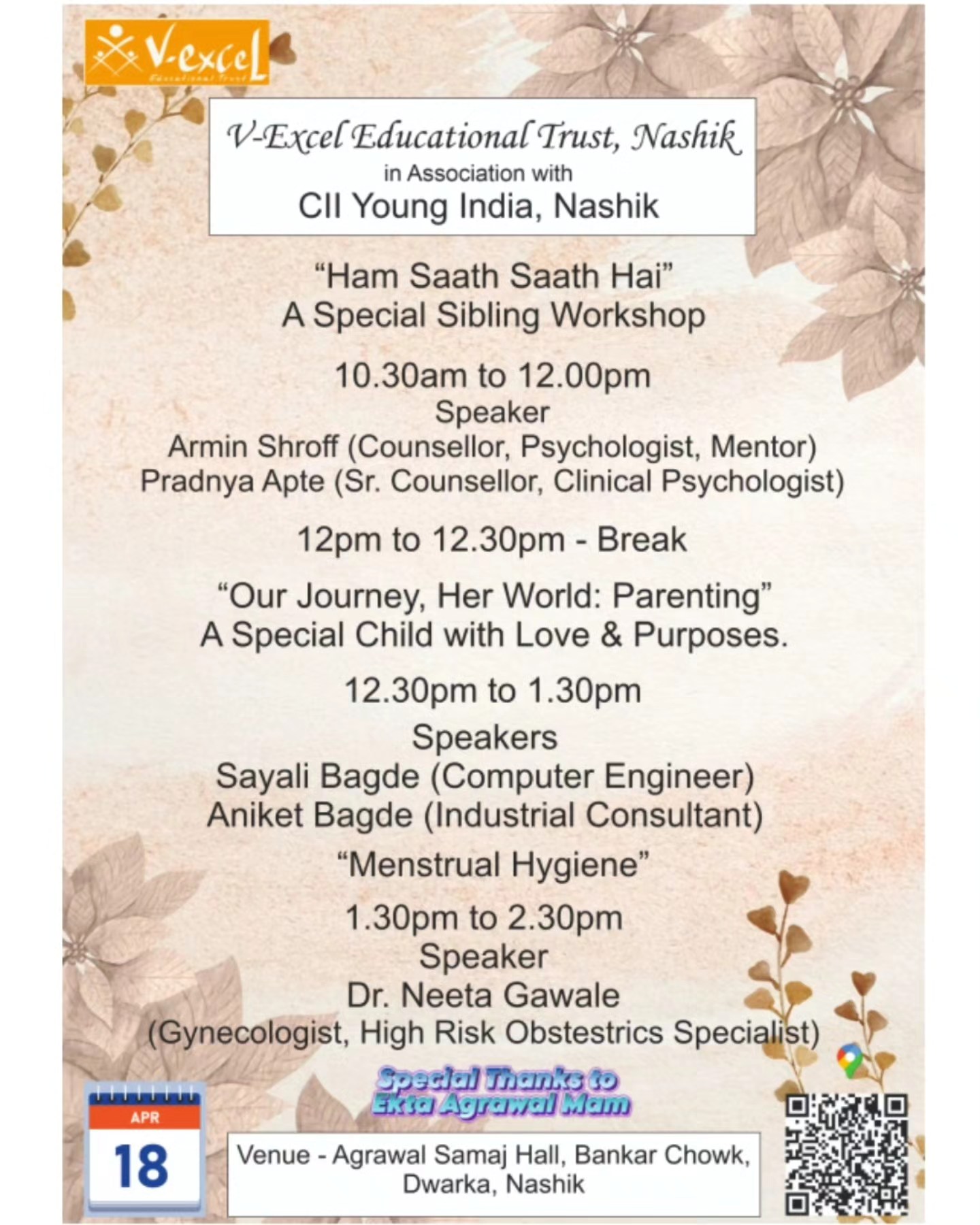 V-Excel Educational Trust, Nashik in collaboration with CII Young India – Nashik is hosting a special sibling workshop on April 18th. This exclusive, free session is open only to the parents and siblings of V-Excel students.