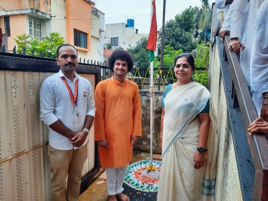 On 15th morning, children, teachers and parents in white dress walked in the colony near our school with flags and banners in their hands and sang patriotic songs. Flag hoisting was done by Dr. Amol Degaonkar (Neurosurgeon) and Dr.Sarika Degaonkar (gynaecologist). Children performed patriotic song,dance and played Rashtra geet on the piano. Sweets were distributed to all the children.