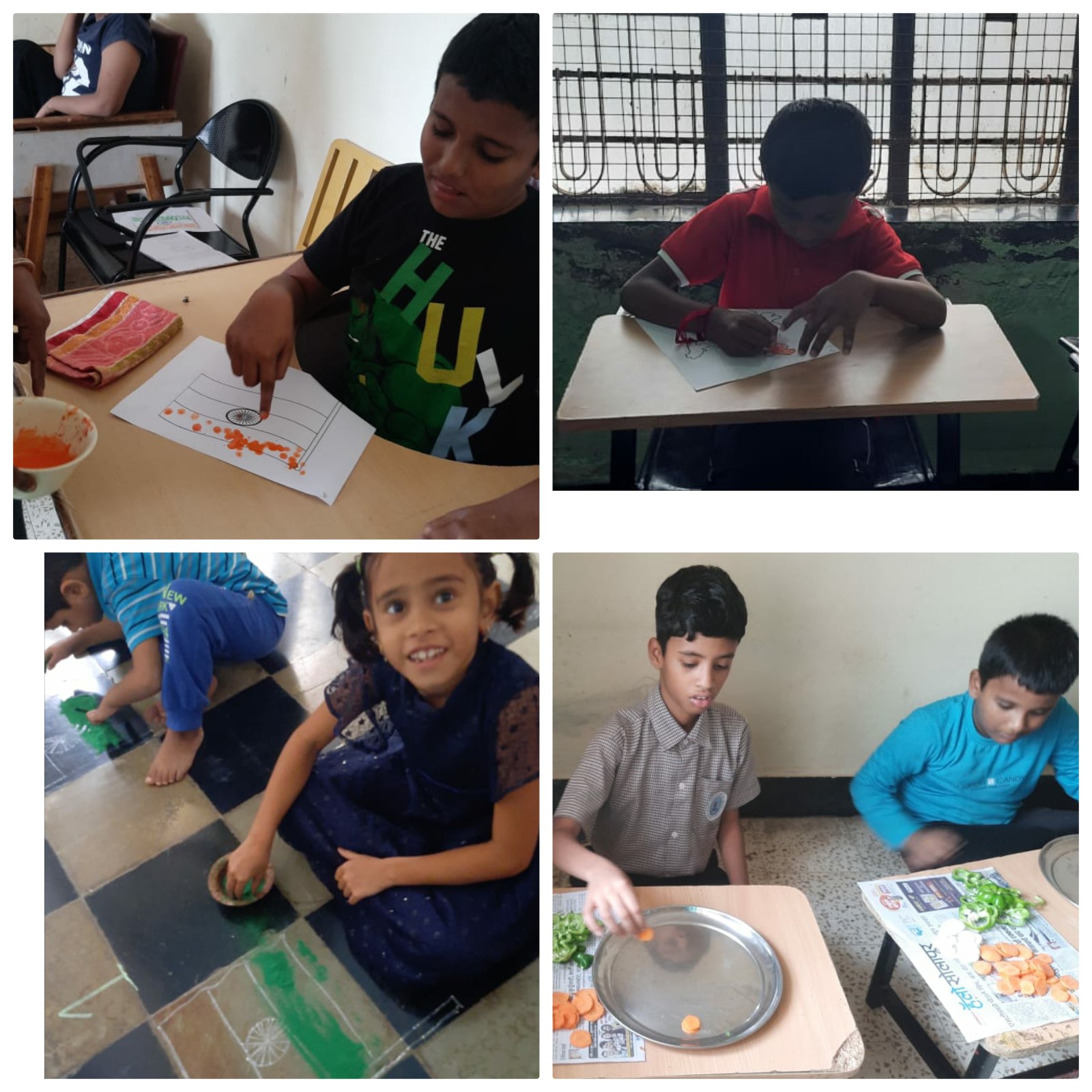 On the occasion of 75th Independence day we conducted different competitions for the kids at our center. The theme was using three colors of the flag and created a patriotic environment. We organised a Coloring , Rangoli making, Thumb Painting and Salad decoration competition. We encouraged children to do things independently and kids did things very well.