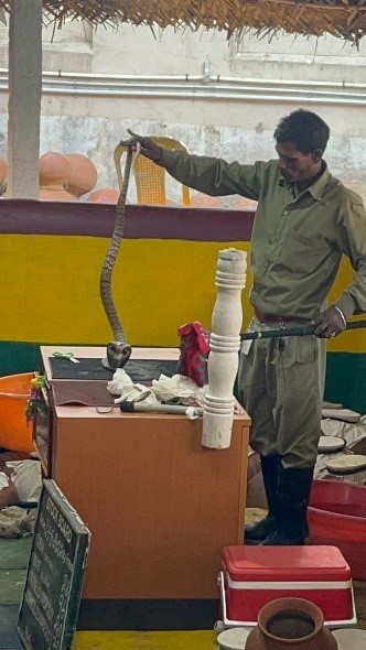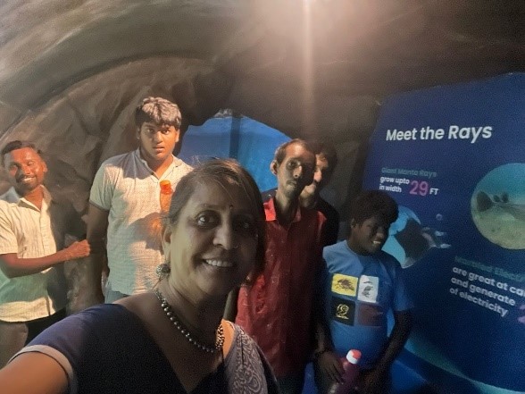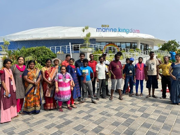 VTU along with Sreyes Farm group visited Crocodile Bank and VGP Marine Kingdom on Aug 26, 2022. Staff of the Crocodile bank took our trainees for a tour and staff explained about each and every variety of crocodile and their habitat. Uma Swaminathan translated it to the trainees accordingly. They walked with so much enthusiasm despite the hot weather and were also well behaved. We had lunch and then watched the removing of snake poison. From there we visited to VGP Aqua Kingdom. This was a wonderful experience for all trainees, and they all enjoyed watching different varieties of fishes and underwater species. Nature with beautiful colors made our trainees happy and calm. They wanted to take photos in front of each colourful species.